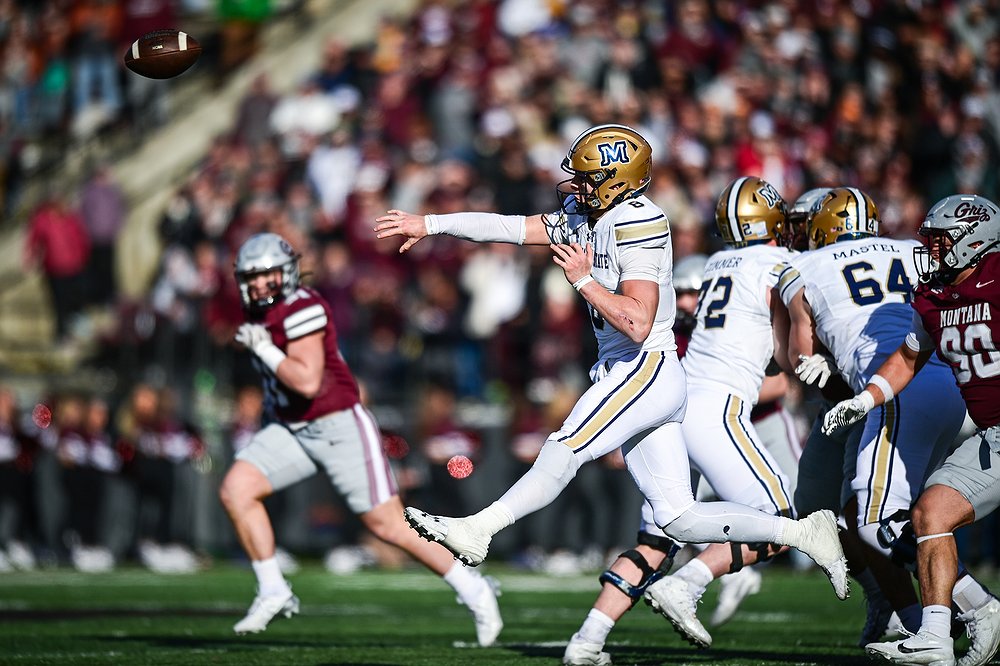 Bobcats quarterback Justin Lamson (8) passes in the second quarter against Montana in the 124th Brawl of the Wild at Washington-Grizzly Stadium on Saturday, Nov. 22. (Casey Kreider/Daily Inter Lake) Casey Kreider