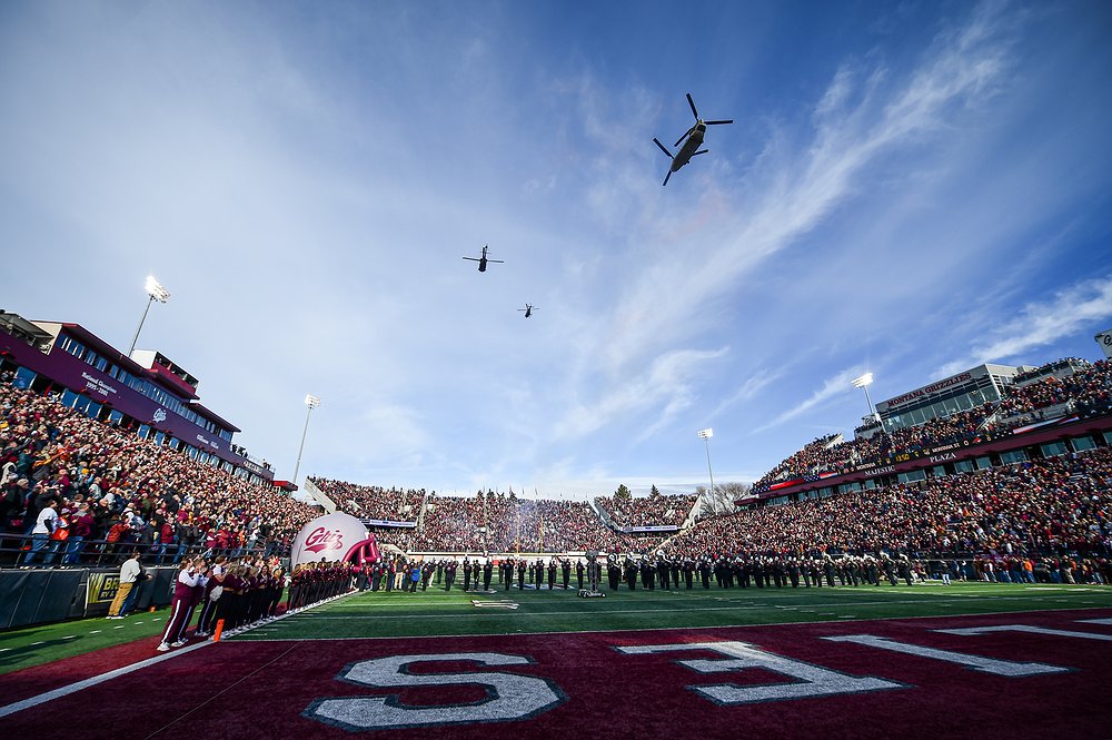 Military helicopters perform a flyover before the start of the 124th Brawl of the Wild at Washington-Grizzly Stadium on Saturday, Nov. 22. (Casey Kreider/Daily Inter Lake)