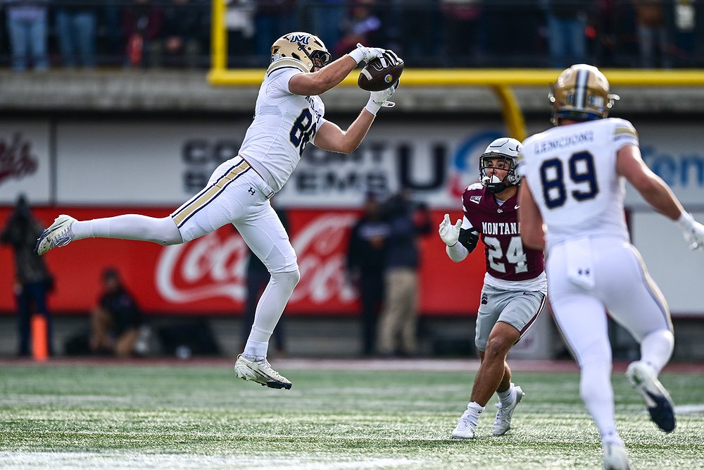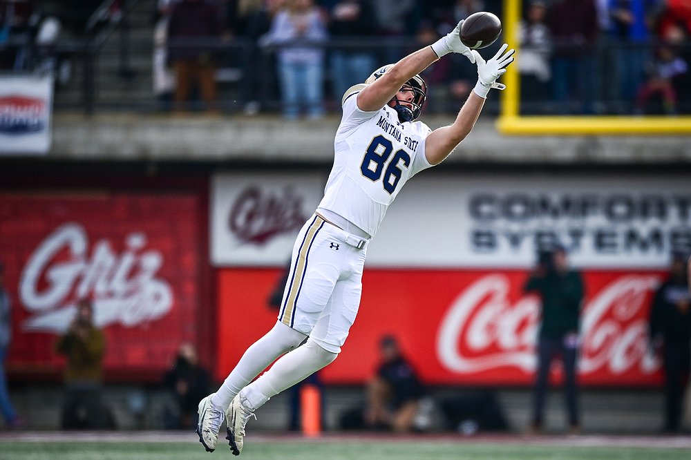Bobcats tight end Hunter Provience (86) makes a leaping catch in the first quarter against Montana in the 124th Brawl of the Wild at Washington-Grizzly Stadium on Saturday, Nov. 22. (Casey Kreider/Daily Inter Lake) Casey Kreider