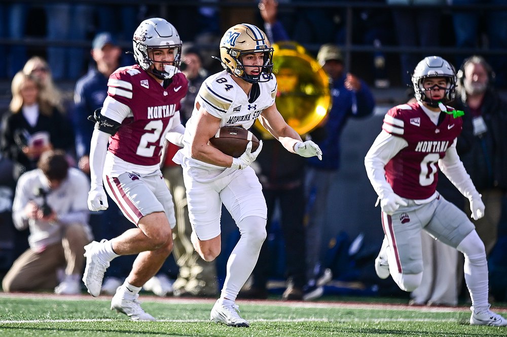 Bobcats wide receiver Dane Steel (84) scores a touchdown on a 27-yard reception in the second quarter against Montana in the 124th Brawl of the Wild at Washington-Grizzly Stadium on Saturday, Nov. 22. (Casey Kreider/Daily Inter Lake) Casey Kreider