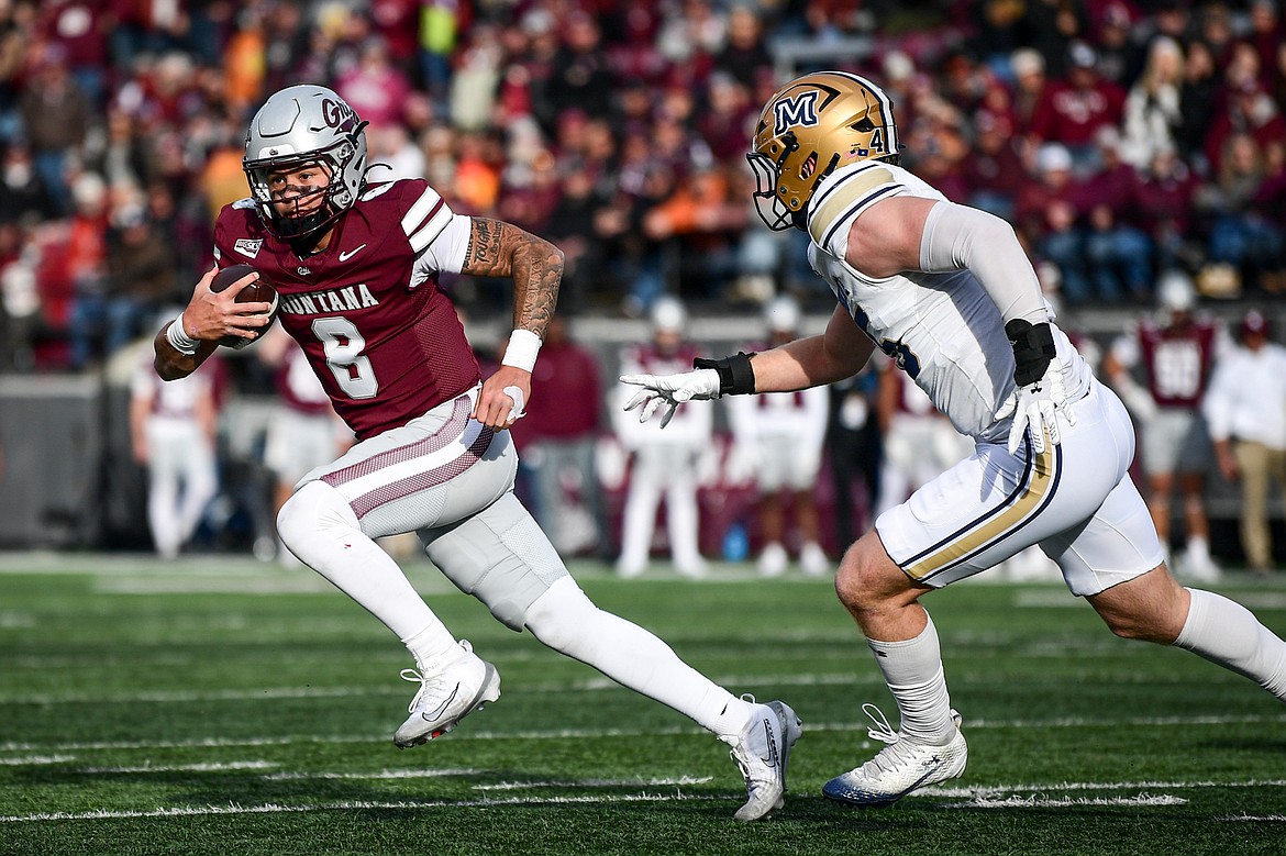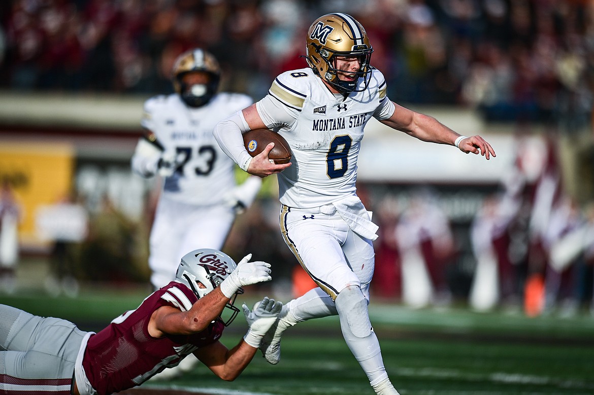 Grizzlies quarterback Keali'i Ah Yat (8) scrambles out of the pocket in the second quarter against Montana State in the 124th Brawl of the Wild at Washington-Grizzly Stadium on Saturday, Nov. 22. (Casey Kreider/Daily Inter Lake) Casey Kreider