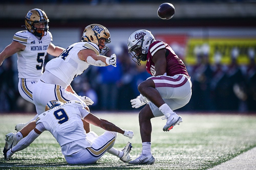 Bobcats defensive back Seth Johnson (9) causes a fumble by Grizzlies running back Eli Gillman (10) in the second quarter in the 124th Brawl of the Wild at Washington-Grizzly Stadium on Saturday, Nov. 22. (Casey Kreider/Daily Inter Lake) Casey Kreider