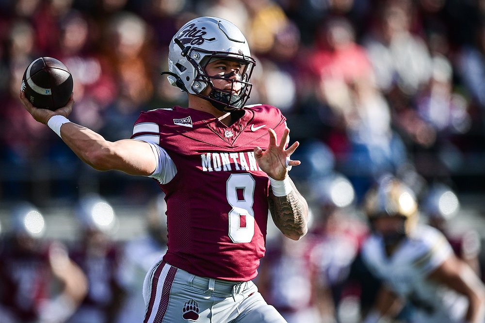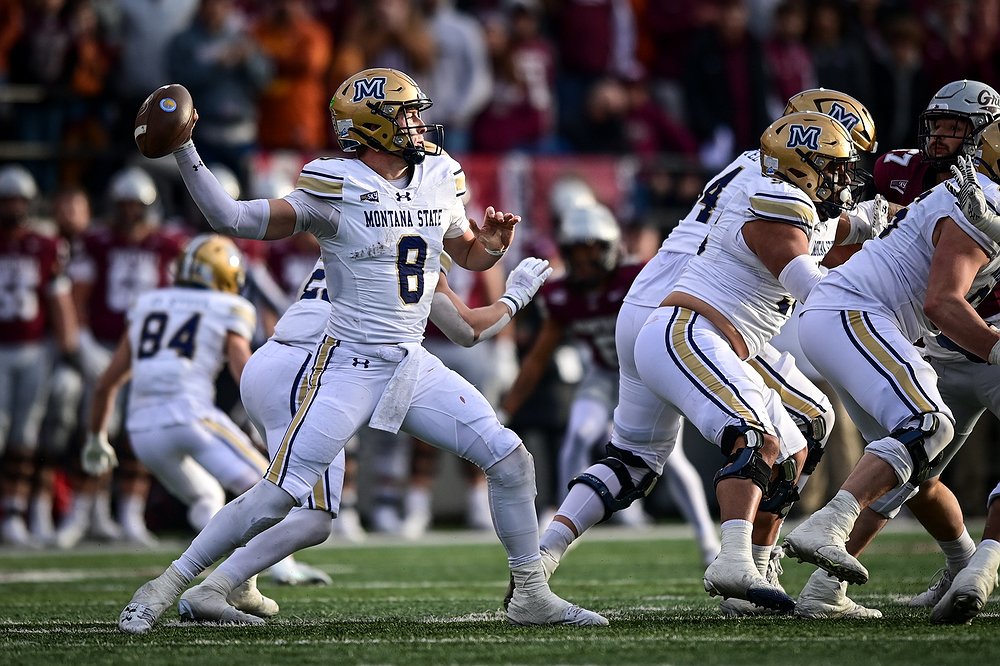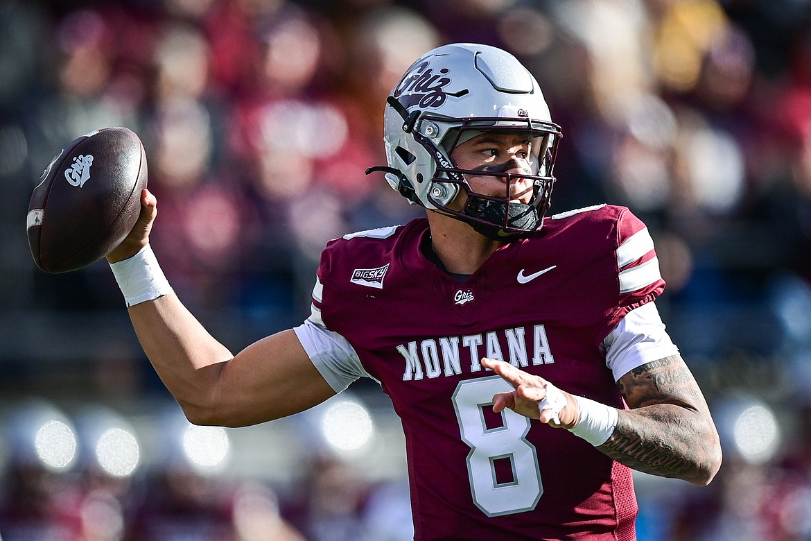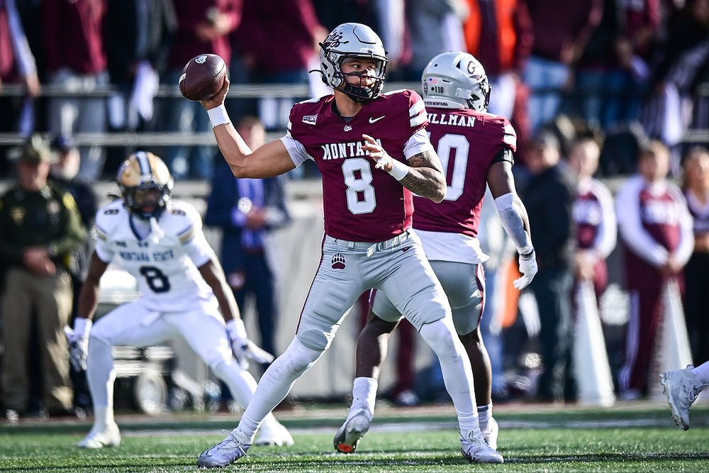 Bobcats quarterback Justin Lamson (8) passes in the fourth quarter against Montana in the 124th Brawl of the Wild at Washington-Grizzly Stadium on Saturday, Nov. 22. (Casey Kreider/Daily Inter Lake) Casey Kreider