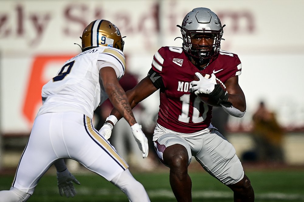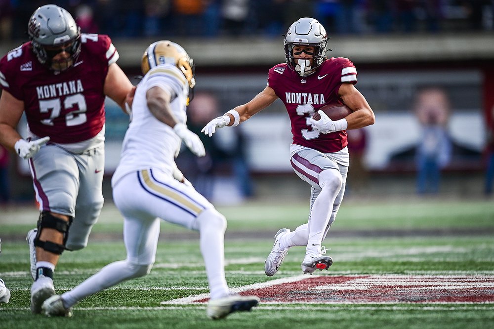 Grizzlies wide receiver Brooks Davis (3) runs after a handoff in the third quarter against Montana State in the 124th Brawl of the Wild at Washington-Grizzly Stadium on Saturday, Nov. 22. (Casey Kreider/Daily Inter Lake)