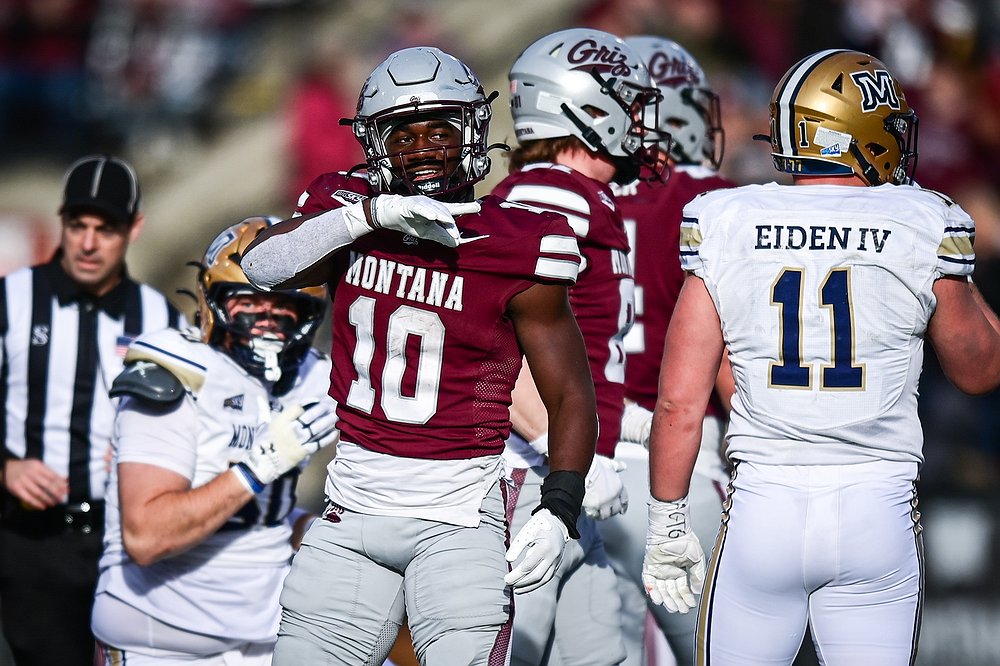 Grizzlies running back Eli Gillman (10) motions for a first down after a run in the third quarter against Montana State in the 124th Brawl of the Wild at Washington-Grizzly Stadium on Saturday, Nov. 22. (Casey Kreider/Daily Inter Lake)