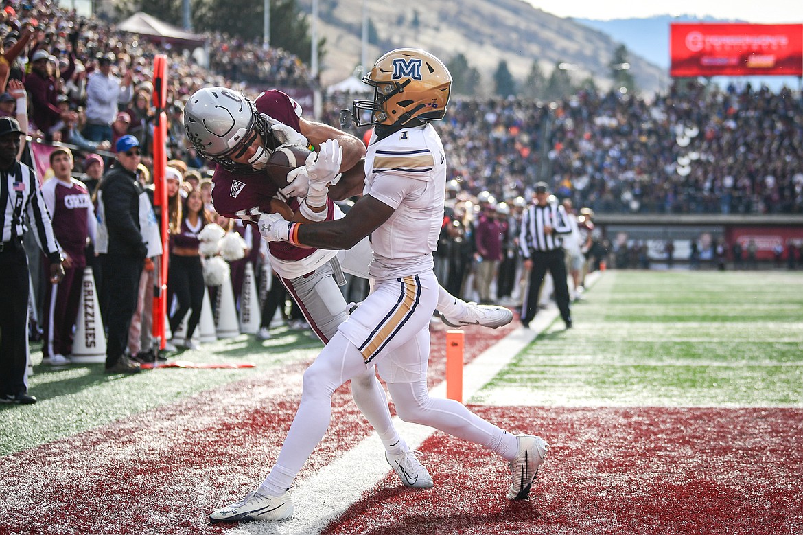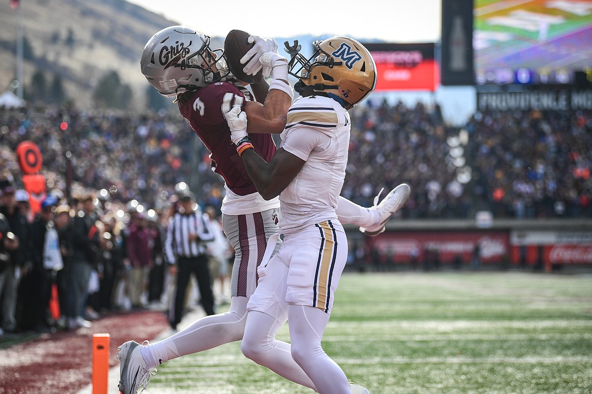Grizzlies wide receiver Brooks Davis (3) catches a 14-yard touchdown reception in the first quarter against Montana State in the 124th Brawl of the Wild at Washington-Grizzly Stadium on Saturday, Nov. 22. (Casey Kreider/Daily Inter Lake) Casey Kreider
