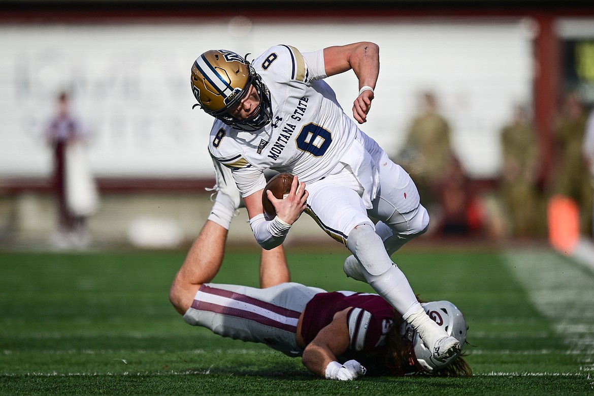 Bobcats quarterback Justin Lamson (8) runs for a gain in the first quarter against Montana in the 124th Brawl of the Wild at Washington-Grizzly Stadium on Saturday, Nov. 22. (Casey Kreider/Daily Inter Lake) Casey Kreider
