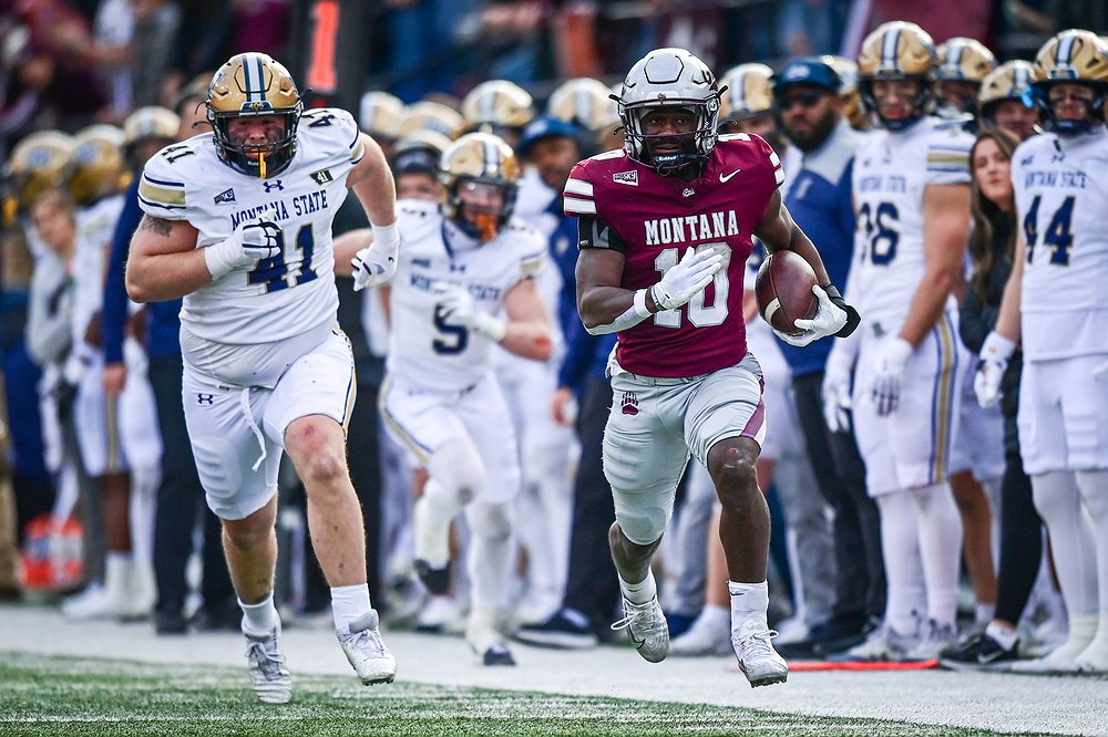 Grizzlies running back Eli Gillman (10) heads down the sideline on a 52-yard touchdown run in the fourth quarter against Montana State in the 124th Brawl of the Wild at Washington-Grizzly Stadium on Saturday, Nov. 22. (Casey Kreider/Daily Inter Lake) Casey Kreider