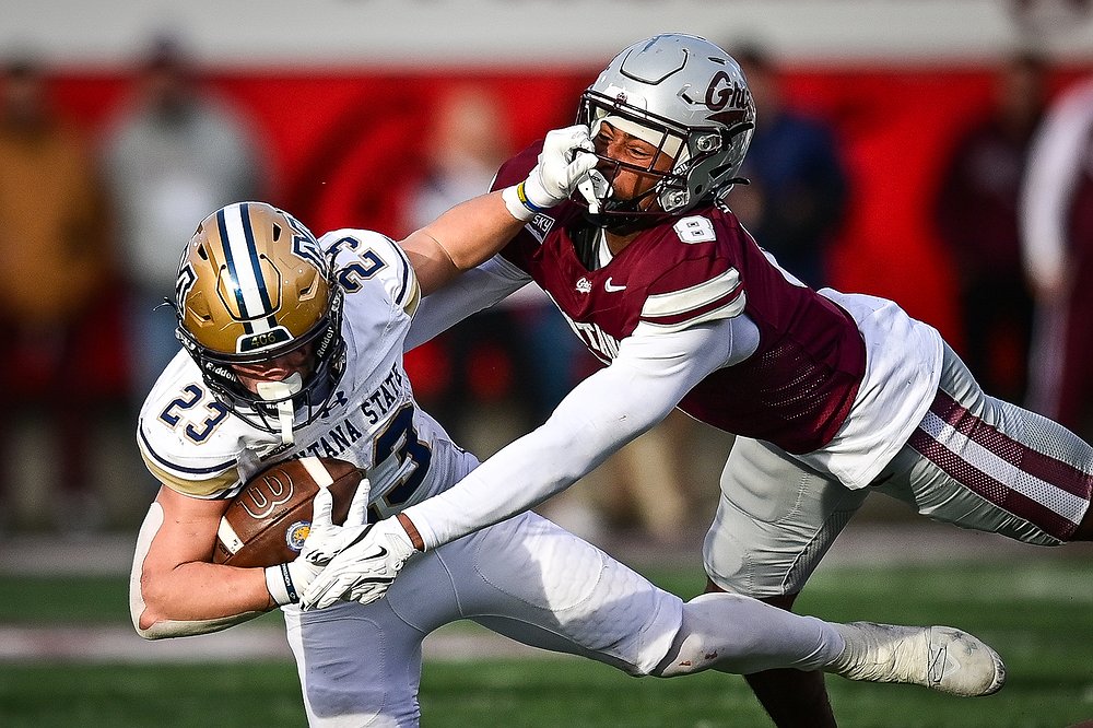 Bobcats defensive back Seth Johnson (9) causes a fumble by Grizzlies running back Eli Gillman (10) in the second quarter in the 124th Brawl of the Wild at Washington-Grizzly Stadium on Saturday, Nov. 22. (Casey Kreider/Daily Inter Lake)