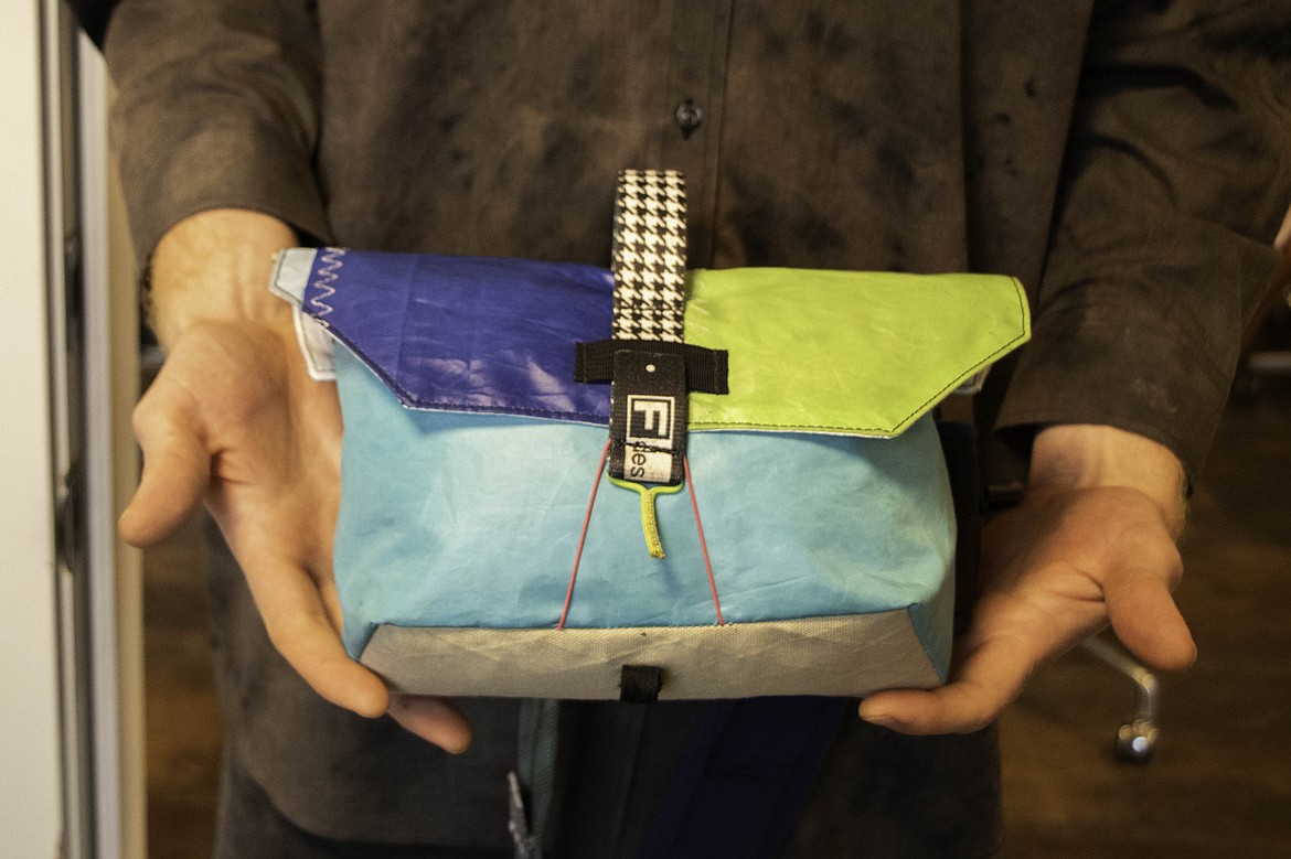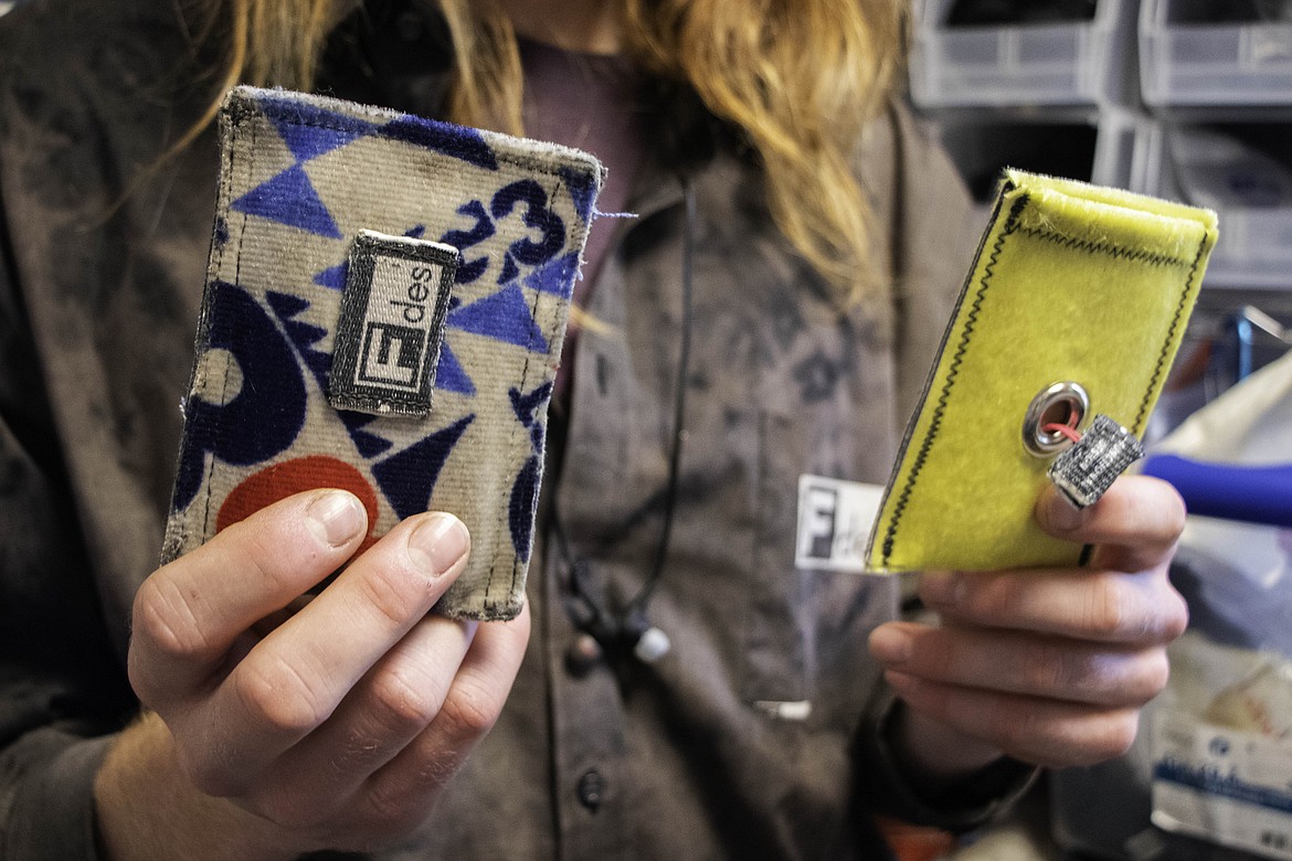 Wearing his tag hat, Barry is working on a series of “Frakentotes” — tote bags made from mis-printed sweatshirts — to sell. He just finished a collection of water-resistant jackets made from an old tent. Everything about Fdes, which stands for functional design, is meant to be functional for both the consumer and the planet.
