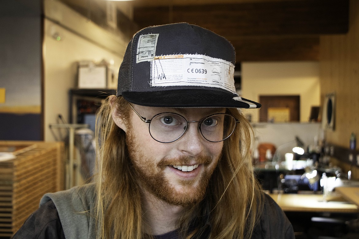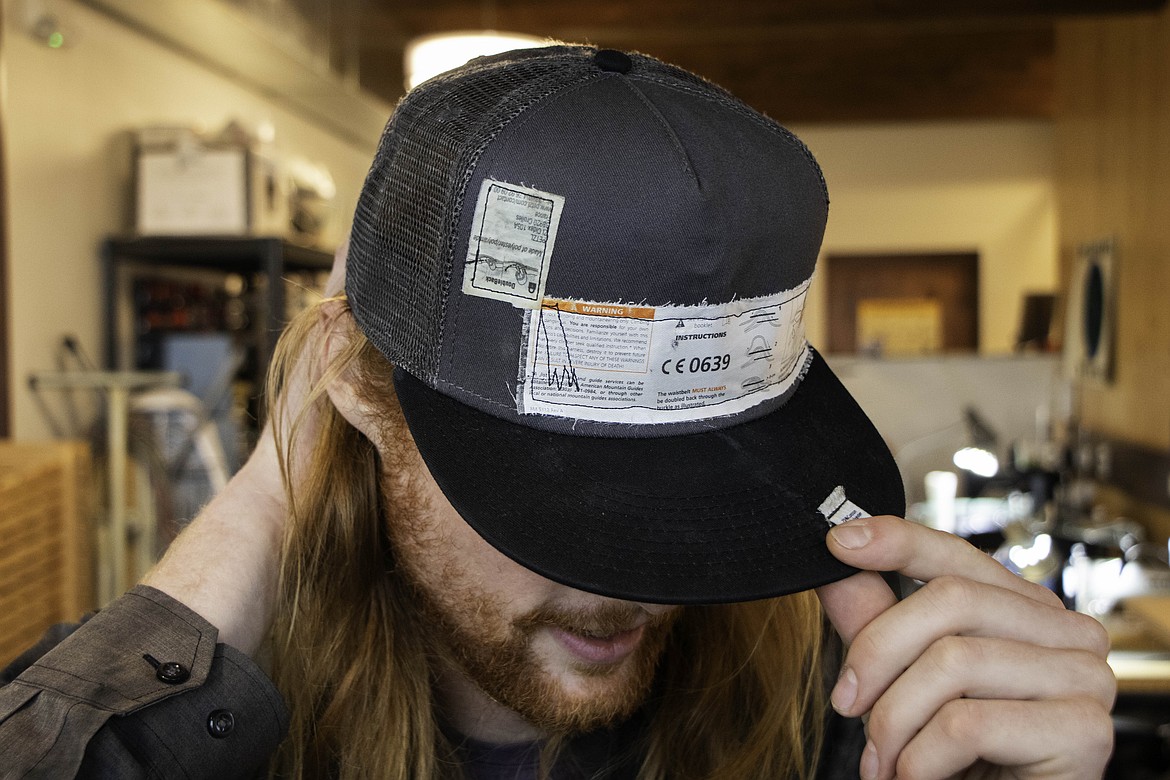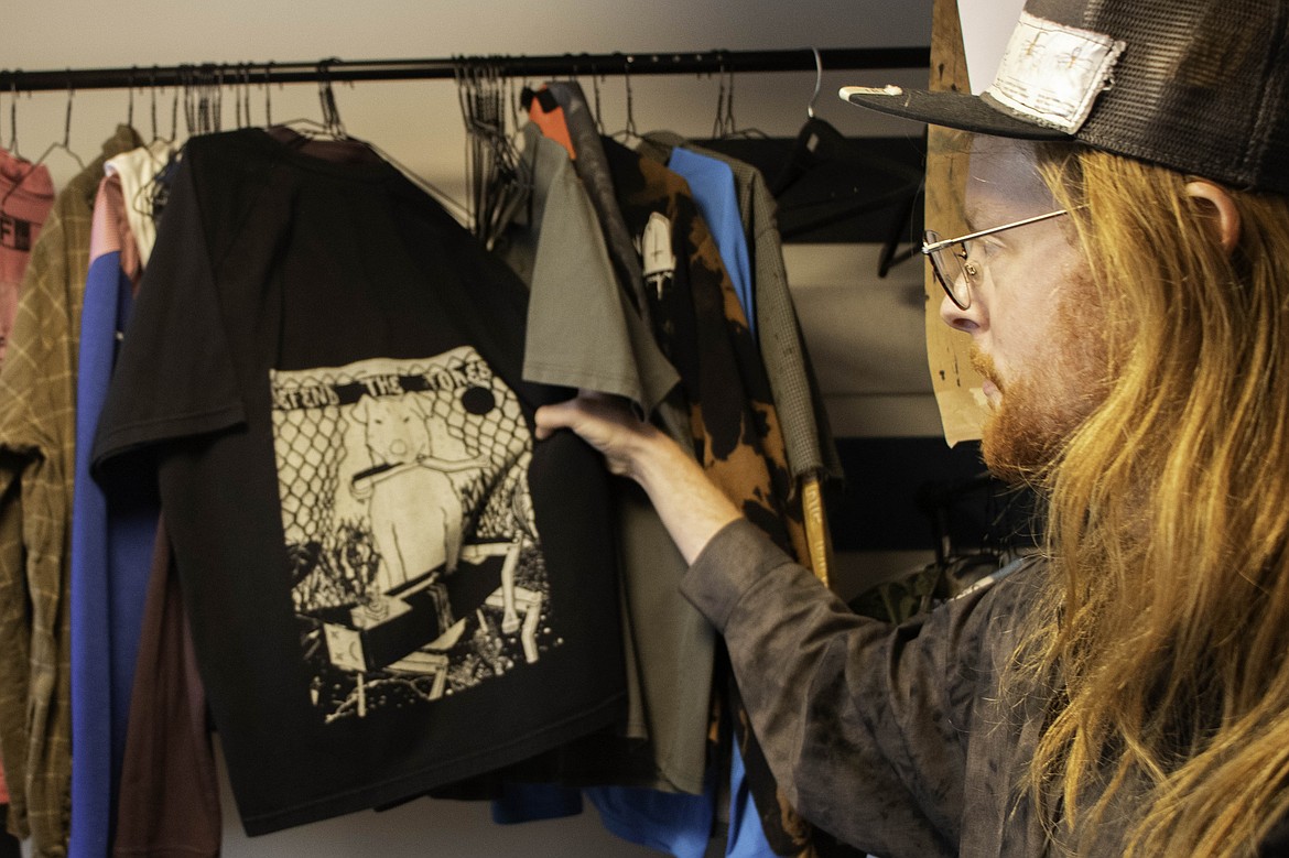 Leaning over a sewing machine earlier this month, the 28-year-old is wearing a button-up shirt bought from a thrift store that he bleach-dyed and screen-printed. His pants are a patched up black pair of Wranglers from Goodwill. Atop his head is a donated plain black hat with gear tags sewn onto the front.
