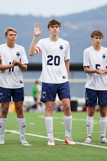 Full caption: Junior defender Peyton Hinthorn (20), one of two Badgers to receive 4A All-Intermountain League honors, waves to the crowd during a regular season game between Sandpoint and Bonners Ferry at War Memorial Field earlier this year. Hinthorn, also a standout on the basketball court, led the Badgers to a 12-9 record and a 64-44 scoring differential, recording two goals and an assist in the process. Also receiving honors in the five-team league was senior Lincoln Hymas (11), pictured left, who finished with eight goals and one assist on the season for the Badgers. Bonners Ferry High head coach Paul Bonnell praised the duo's positive attitudes, hard work ethic, and contributions to the team. "They are leaders by example, both serving as team captains," Bonnell noted. "They play with intensity but are also calm and cool on the field."