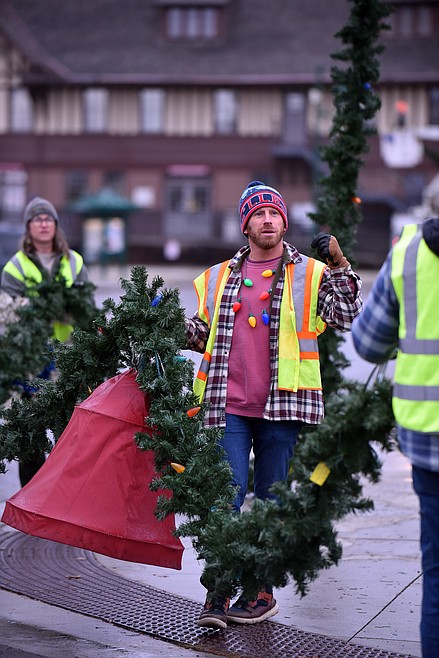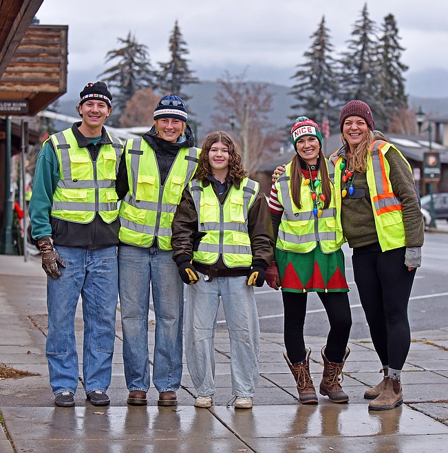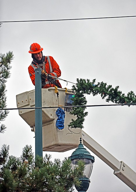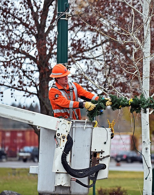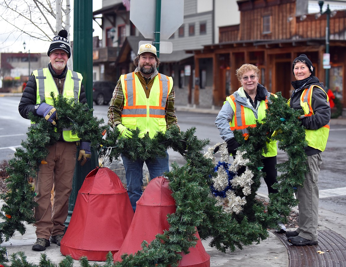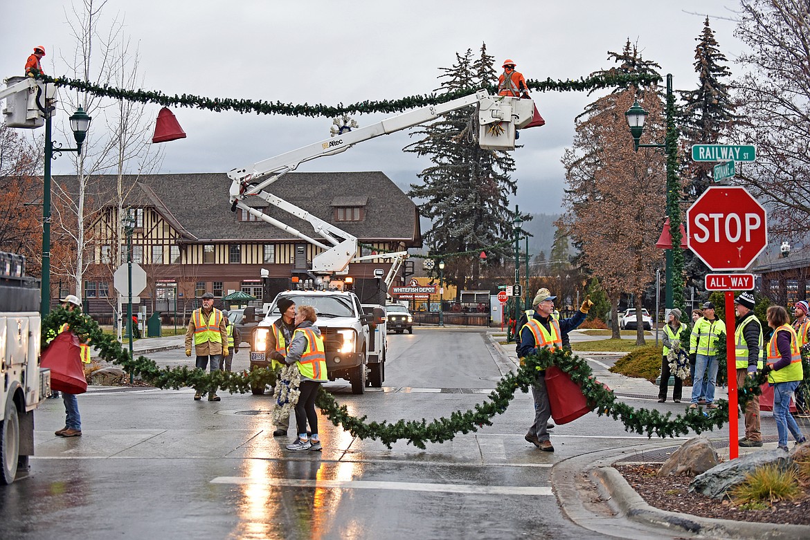 It was cold, dark and wet on Sunday morning, but that didn’t deter a team of volunteers, including several bucket trucks from the Flathead Electric Cooperative, from installing the winter decorations in downtown Whitefish. A new addition to the sparkle is 13 lighted snowflakes drifting over the viaduct.