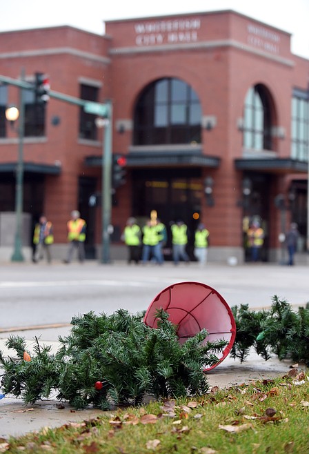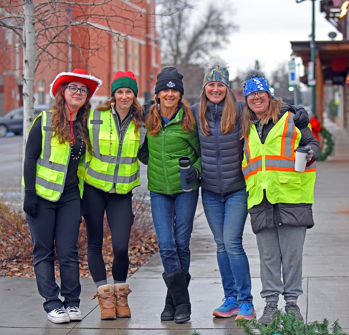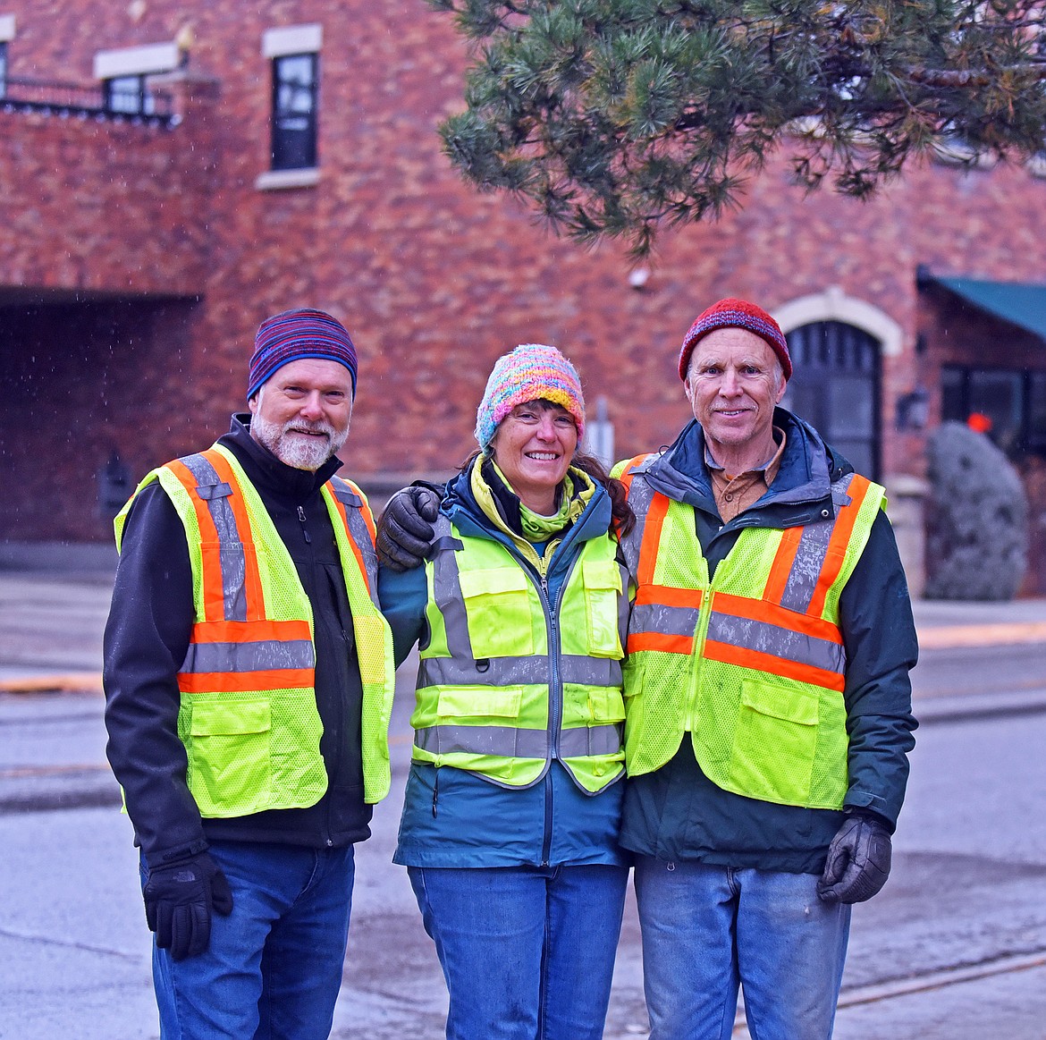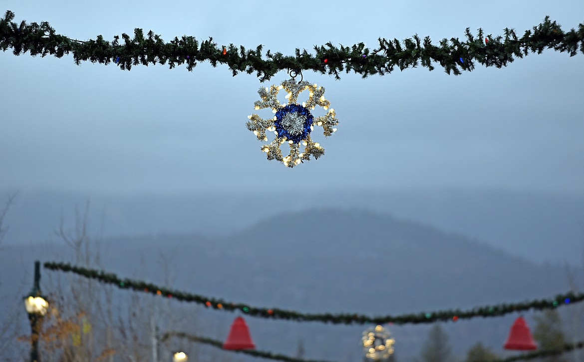 It was cold, dark and wet on Sunday morning, but that didn’t deter a team of volunteers, including several bucket trucks from the Flathead Electric Cooperative, from installing the winter decorations in downtown Whitefish. A new addition to the sparkle is 13 lighted snowflakes drifting over the viaduct.