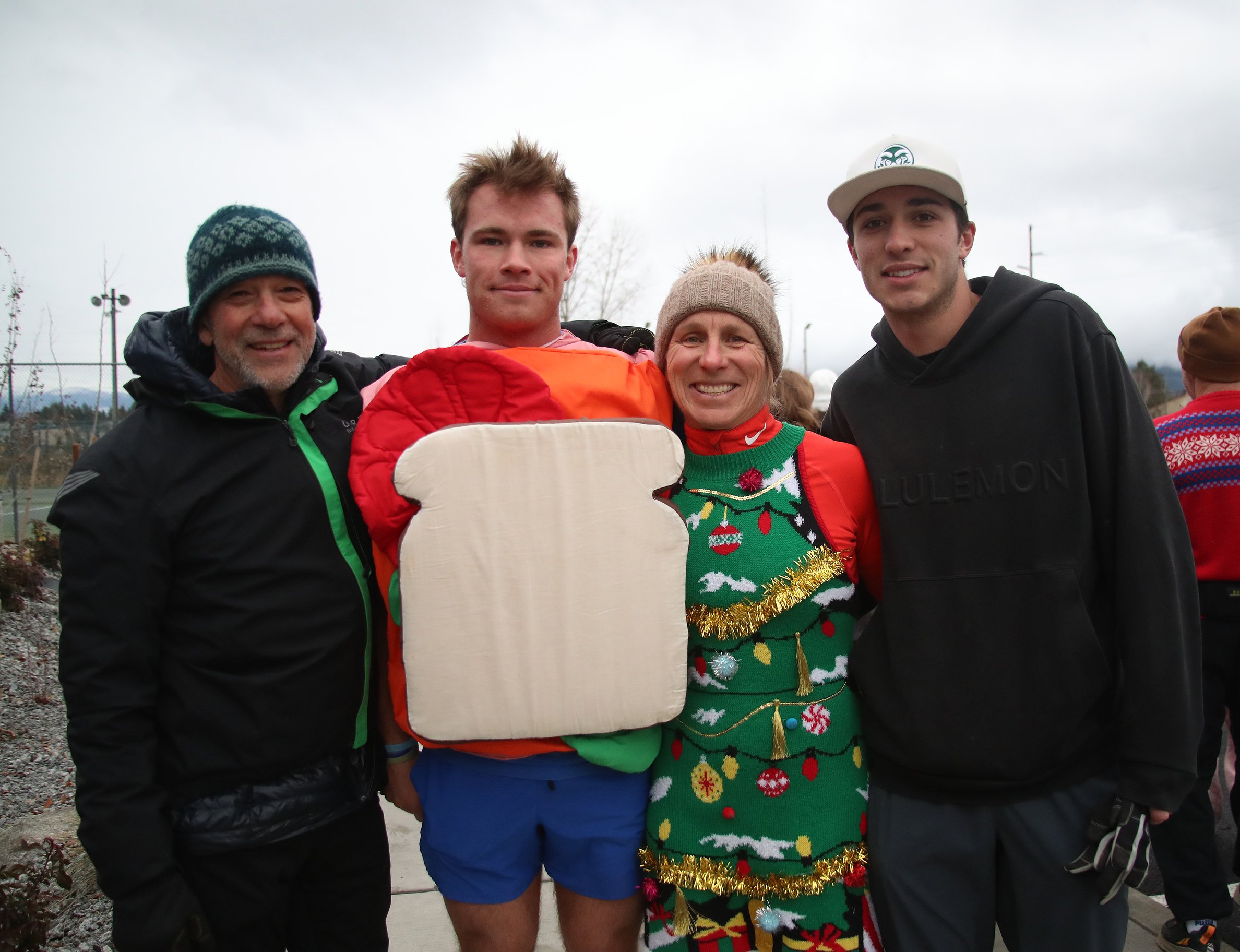 Deb Ruehle, who came to the run with her partner and sons Slate and Klein Fragoso, said the event is a fun way to start Thanksgiving Day, which includes dressing up in costumes or holiday outfits. This year, Slate Fragoso came dressed in an old ham sandwich costume from a long-ago Halloween and Ruehle in a cheery Christmas tree apron worn over her running gear.