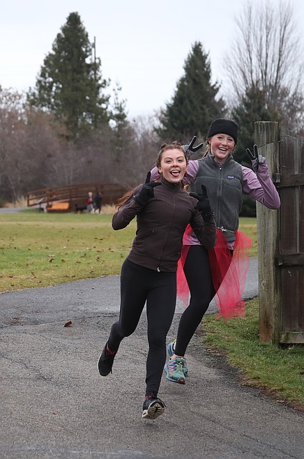 Deb Ruehle, who came to the run with her partner and sons Slate and Klein Fragoso, said the event is a fun way to start Thanksgiving Day, which includes dressing up in costumes or holiday outfits. This year, Slate Fragoso came dressed in an old ham sandwich costume from a long-ago Halloween and Ruehle in a cheery Christmas tree apron worn over her running gear.