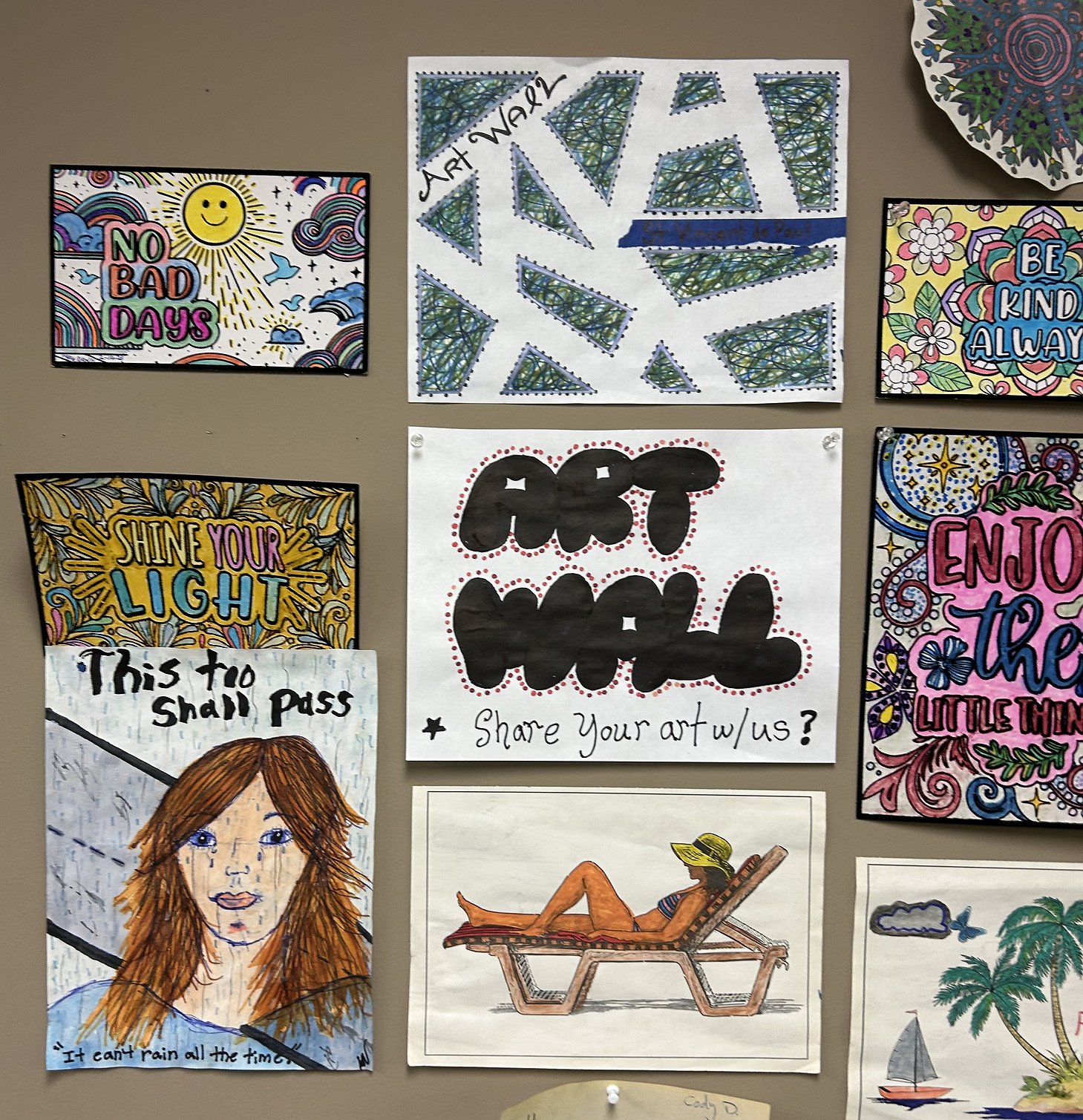 The warming shelter has food and drink available. Couches provide places to sit and watch TV or play board games. Bunk beds are arranged in the far corner. An art wall displays drawings and paintings of talented guests.