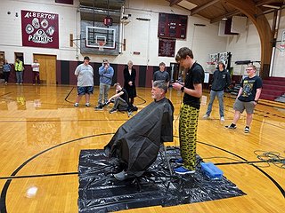 Assistant Coach/K-12 PE Teacher Brad ODell getting his head shaved by the football team after their victory against Heart Butte 58-7. This is the first win for the Panther program after disbanding the cooperative they had with Superior School District. Quarterback Devin Hill is seen shaving ODell's head after they made a bet - with a win the coach's head was shaved, and a loss Devin would have had his head shaved. Pictured in the background Michael Seidel, Barrett ODell, Logan Henry (seated), Riley Hower, David Scheer, Baylar Baughman, and Even Fehlings. Not pictured Tam Dao, Josiah Morton, Shea Fredette, and Tater Herman. Panther Spirit at its finest! (Photo by Amanda Cyr)ARTICLES BY MONTE TURNER