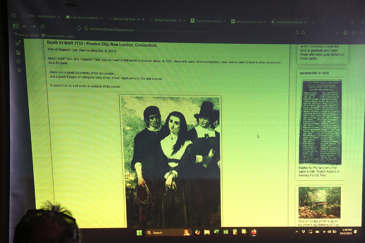 As a genealogist, Mize peered into her own past to see if her family had any ties to this turbulent time in history. She shared those ties during her presentation, "Early American Witches," at the Hayden Library.