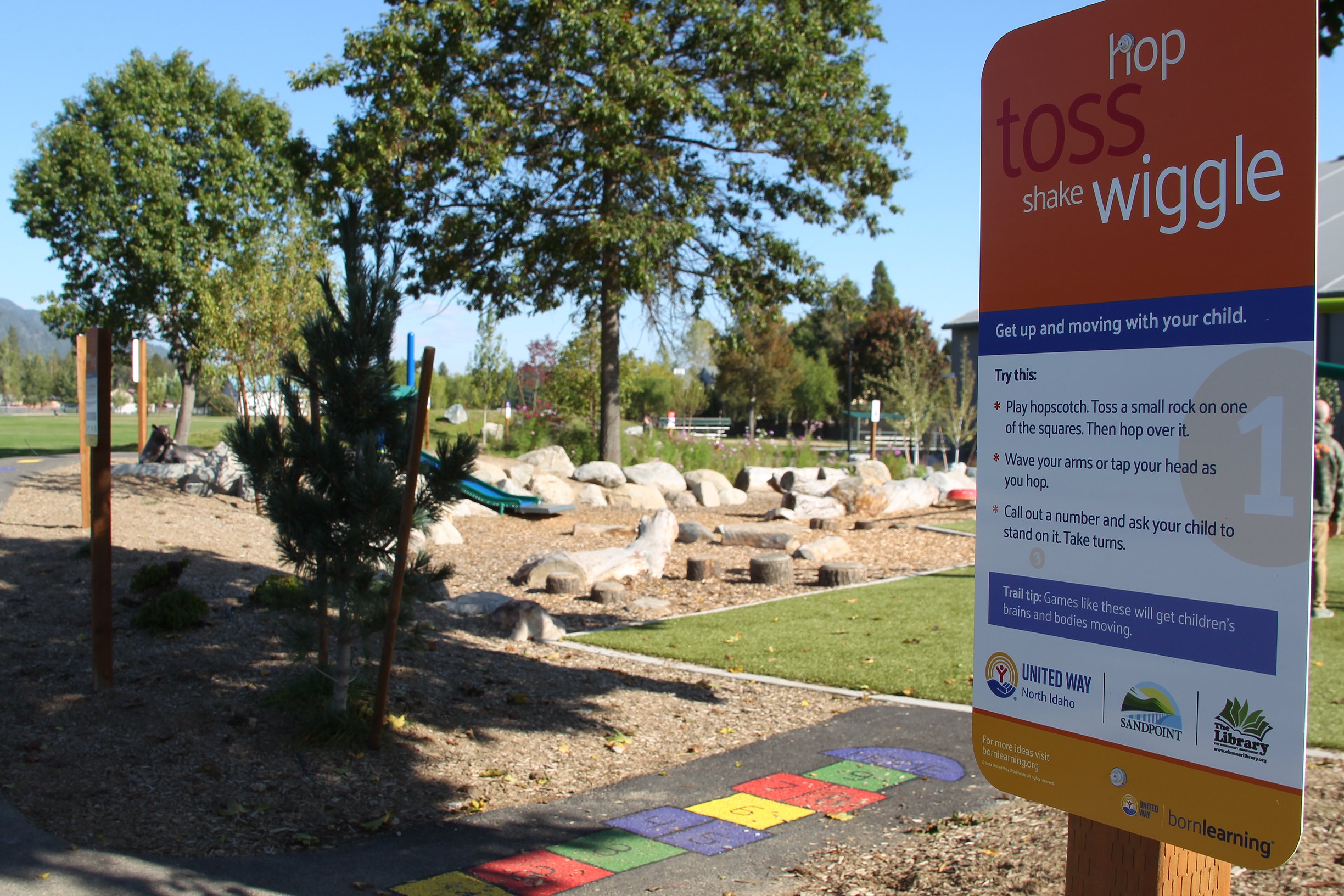 Thanks to donations from United Way North Idaho and the East Bonner County Library, the trail features 10 signs and painted elements to encourage an active learning environment at the park. Located behind the playground, parents are encouraged to take their children hopscotching, tell them a story about the past or impersonate their favorite animals together.