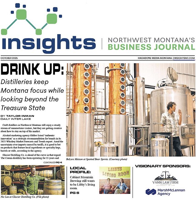 This month’s Insights focuses on those makers. In Coram, Glacier Distilling has spent 15 years building a lineup of spirits rooted in Montanagrown ingredients. Whitefish-based Spotted Bear Spirits continues that tradition while exploring new markets beyond our borders. And in Libby, Cabinet Mountain Brewing Co. has become “Libby’s living room,” proving that small businesses can help revitalize a downtown while creating gathering places for neighbors. These businesses are producing their craft with local ingredients while giving back to their industry and the communities that help them — and many others in the field — thrive across our region.
