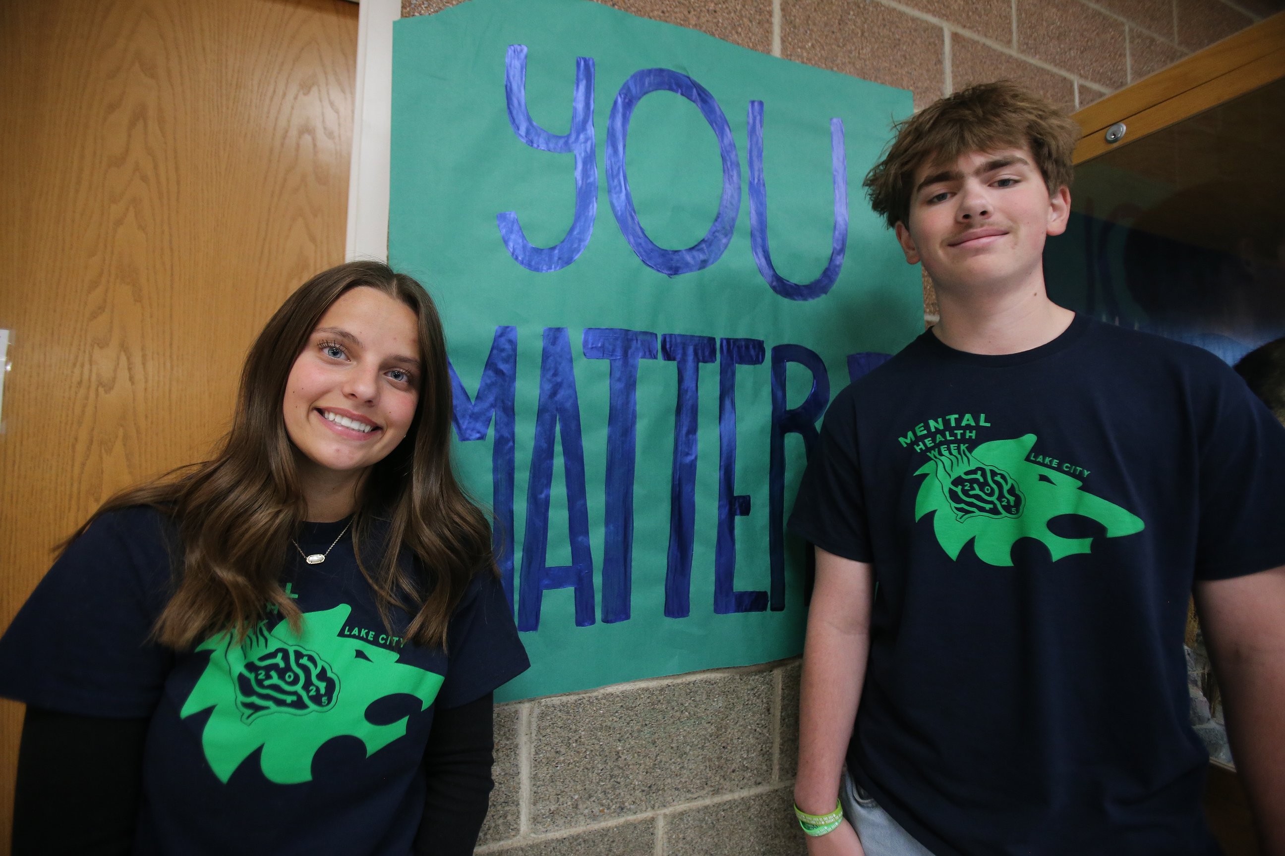 Lake City High School ASB President Tessa Petersen and Junior Class Representative Andy Wisdom proudly wear their Mental Health Week shirts as they stand in front of a "You matter" sign Thursday. "We want to make a difference in our schools and we want to make a difference in our communities," Tessa said.ARTICLES BY DEVIN WEEKS