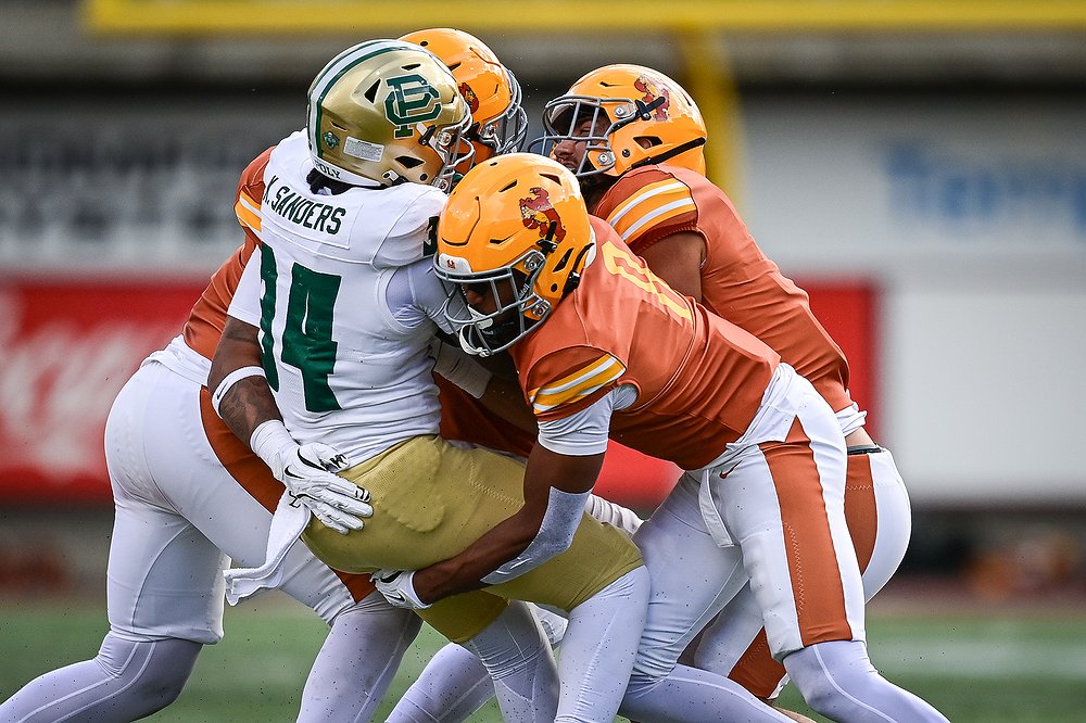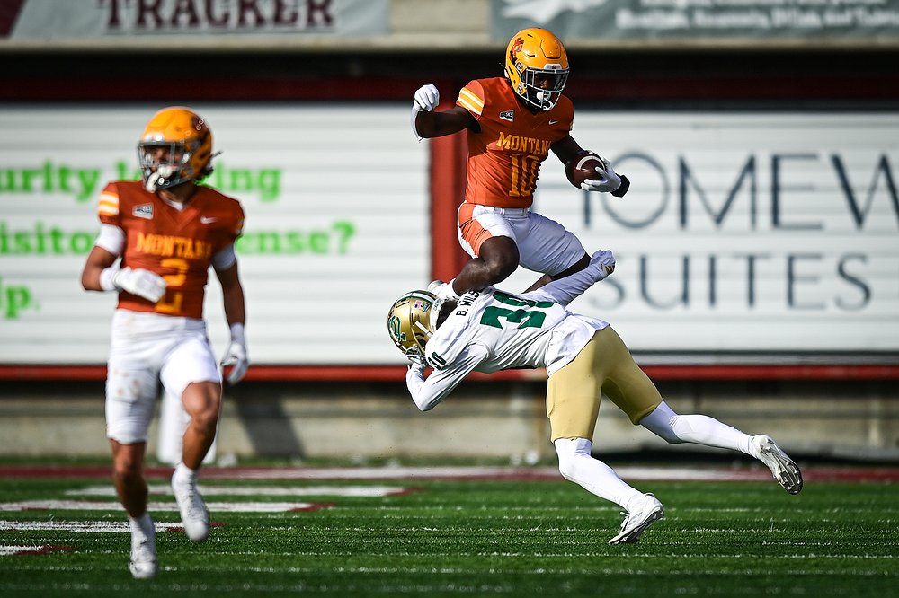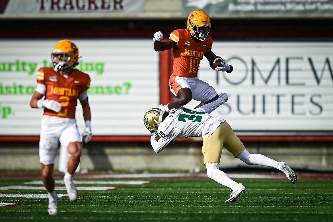 Grizzlies defender Eli Gillman (10) attempts to hurdle a Cal Poly defender in the fourth quarter at Washington-Grizzly Stadium on Saturday, Oct. 11. (Casey Kreider/Daily Inter Lake)