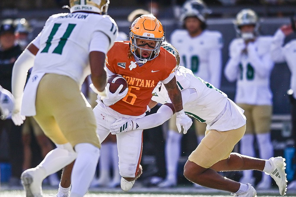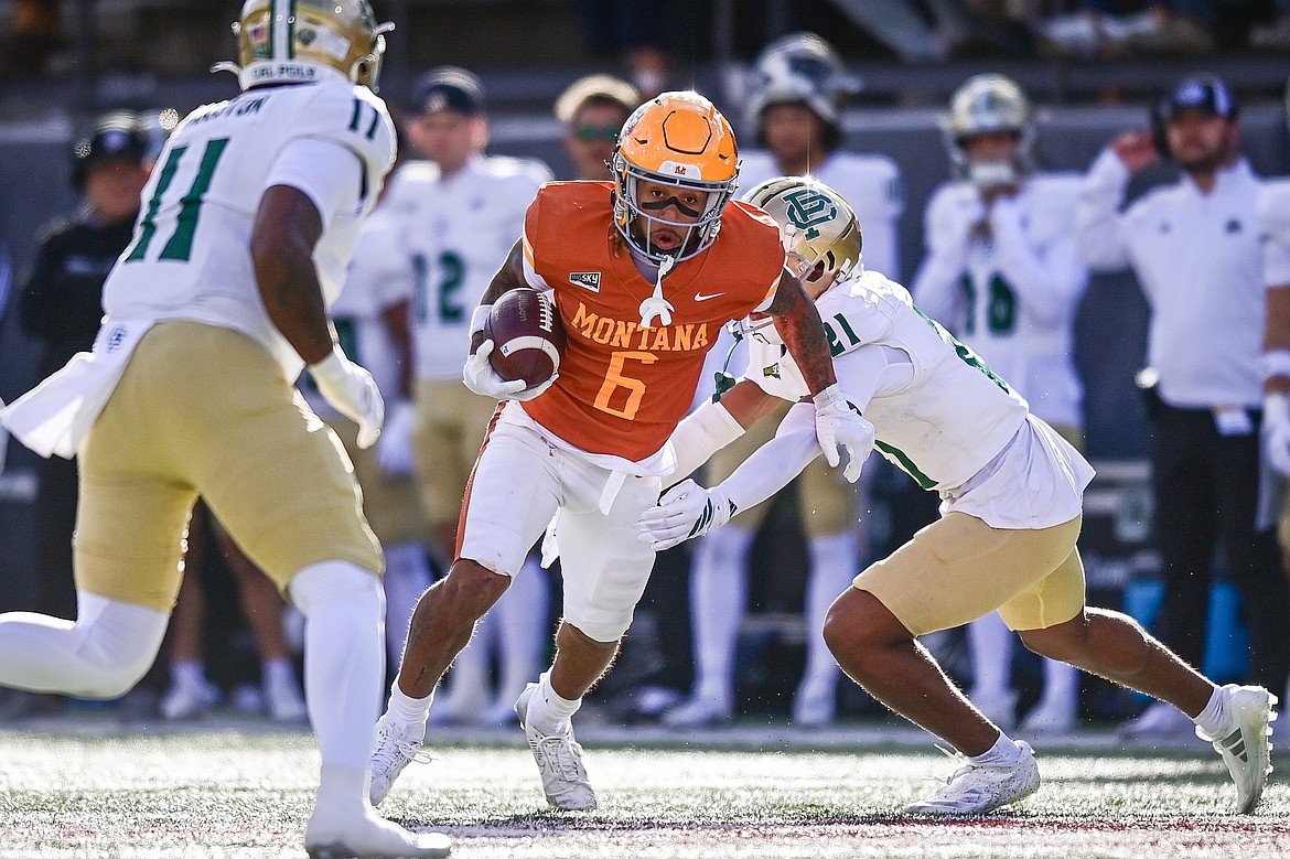 Grizzlies wide receiver Michael Wortham (6) picks up yardage on a reception in the third quarter against Cal Poly at Washington-Grizzly Stadium on Saturday, Oct. 11. (Casey Kreider/Daily Inter Lake)
