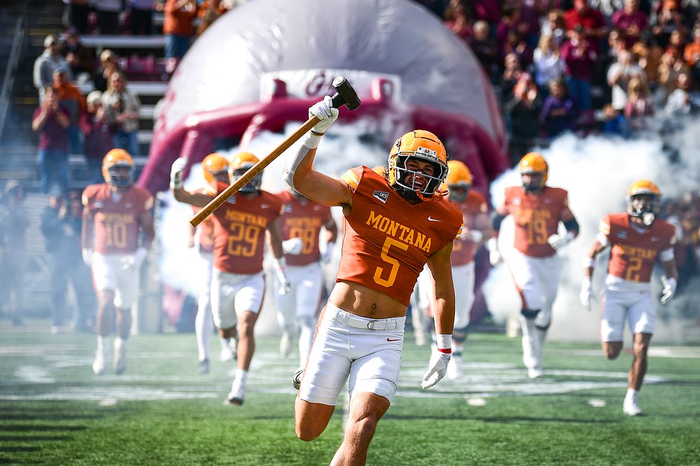 Wide receiver Ian Finch (5) leads the Grizzlies out onto the field before their game against Cal Poly at Washington-Grizzly Stadium on Saturday, Oct. 11. (Casey Kreider/Daily Inter Lake)