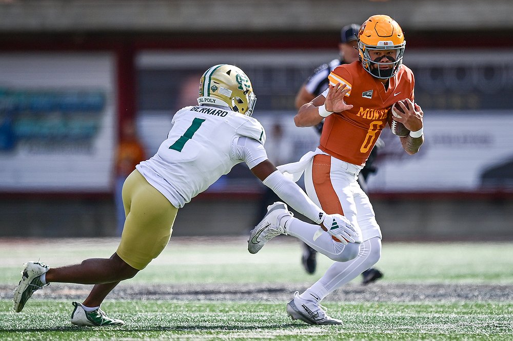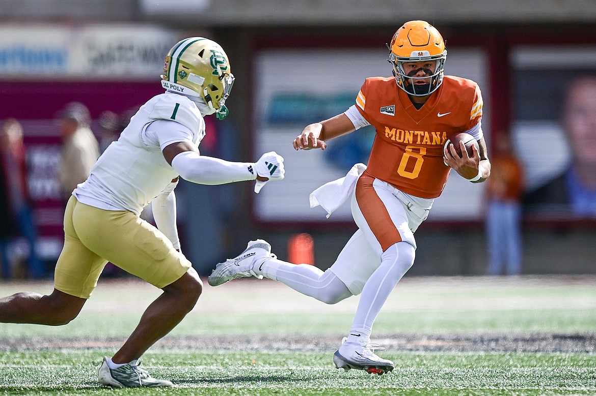 Grizzlies quarterback Keali'i Ah Yat (8) picks up yardage on a run in the first quarter against Cal Poly at Washington-Grizzly Stadium on Saturday, Oct. 11. (Casey Kreider/Daily Inter Lake)