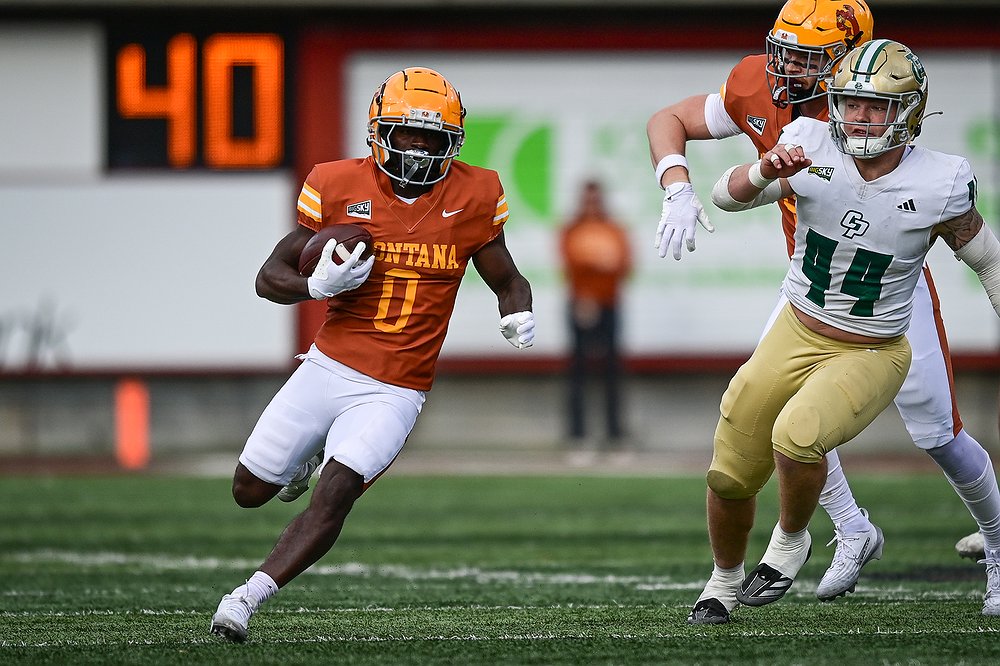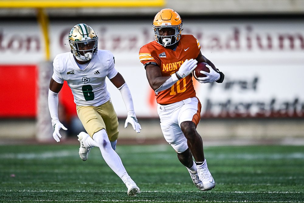 Grizzlies wide receiver Monte Gillman (0) picks up yardage on a run in the second quarter against Cal Poly at Washington-Grizzly Stadium on Saturday, Oct. 11. (Casey Kreider/Daily Inter Lake)