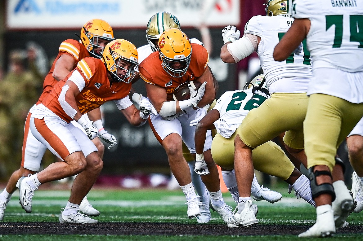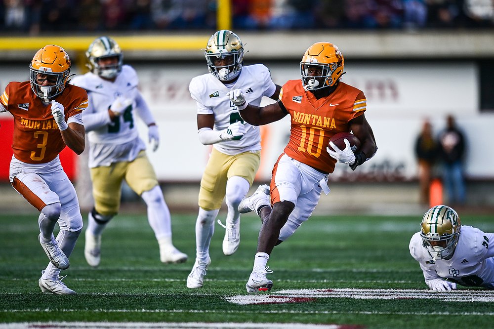Grizzlies running back Eli Gillman (10) picks up yardage on a run in the fourth quarter against Cal Poly at Washington-Grizzly Stadium on Saturday, Oct. 11. (Casey Kreider/Daily Inter Lake)