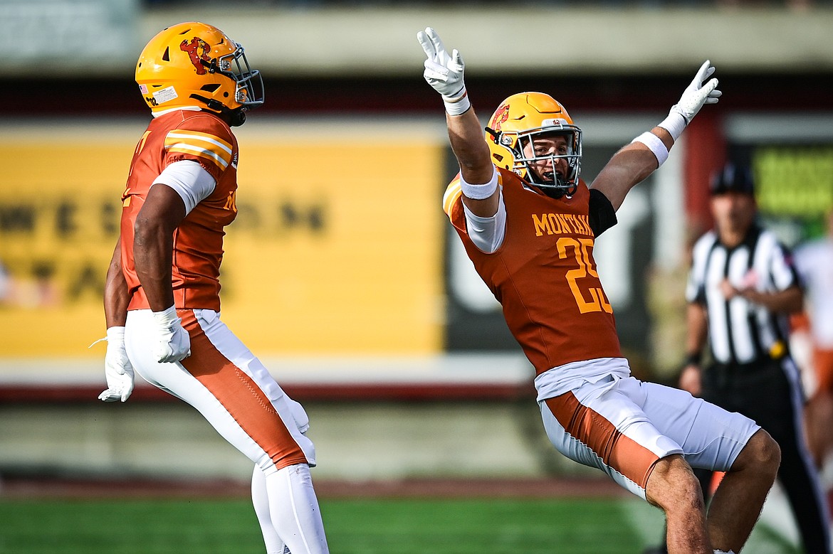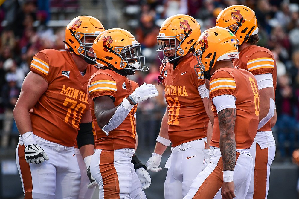Grizzlies running back Eli Gillman (10) celebrates with teammates after 13-yard touchdown run in the fourth quarter against Cal Poly at Washington-Grizzly Stadium on Saturday, Oct. 11. (Casey Kreider/Daily Inter Lake)