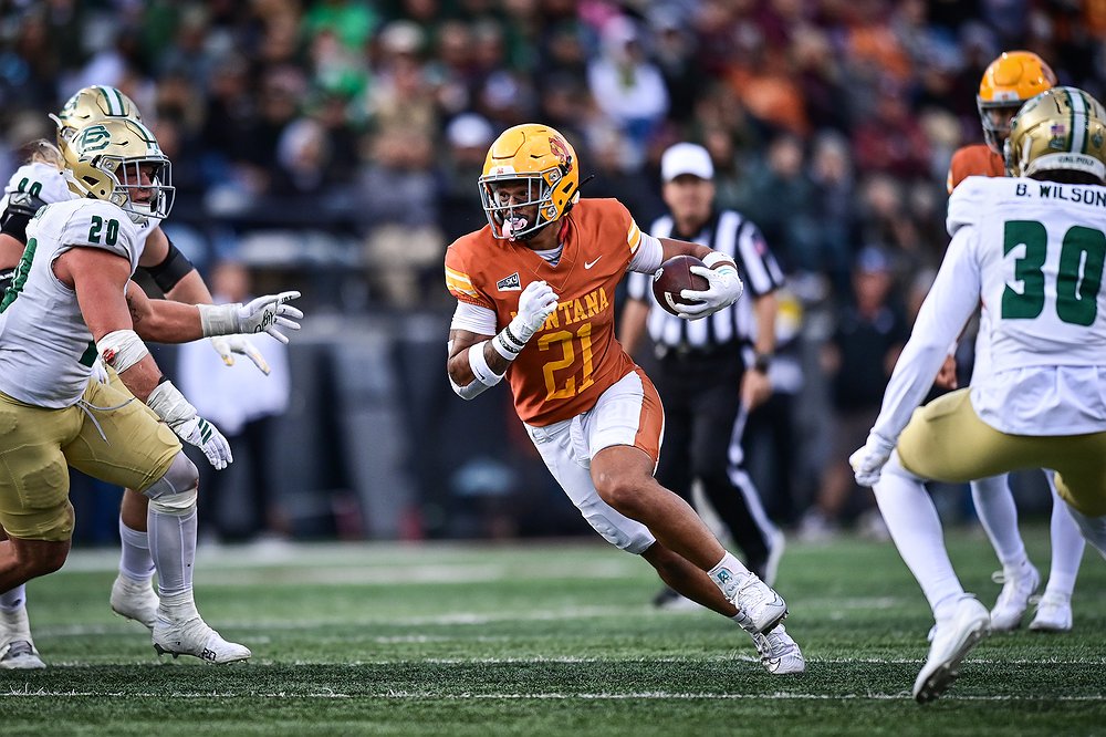 Grizzlies running back Stevie Rocker Jr. (21) looks for an opening in the fourth quarter against Cal Poly at Washington-Grizzly Stadium on Saturday, Oct. 11. (Casey Kreider/Daily Inter Lake)
