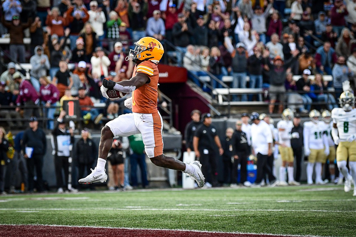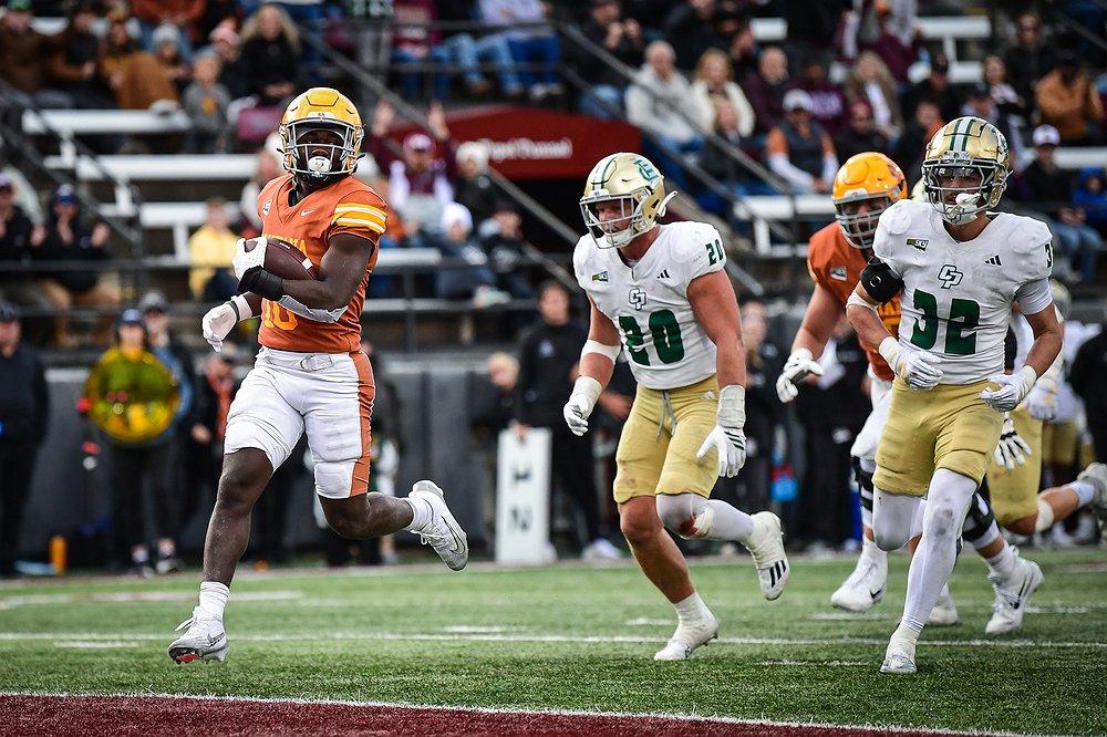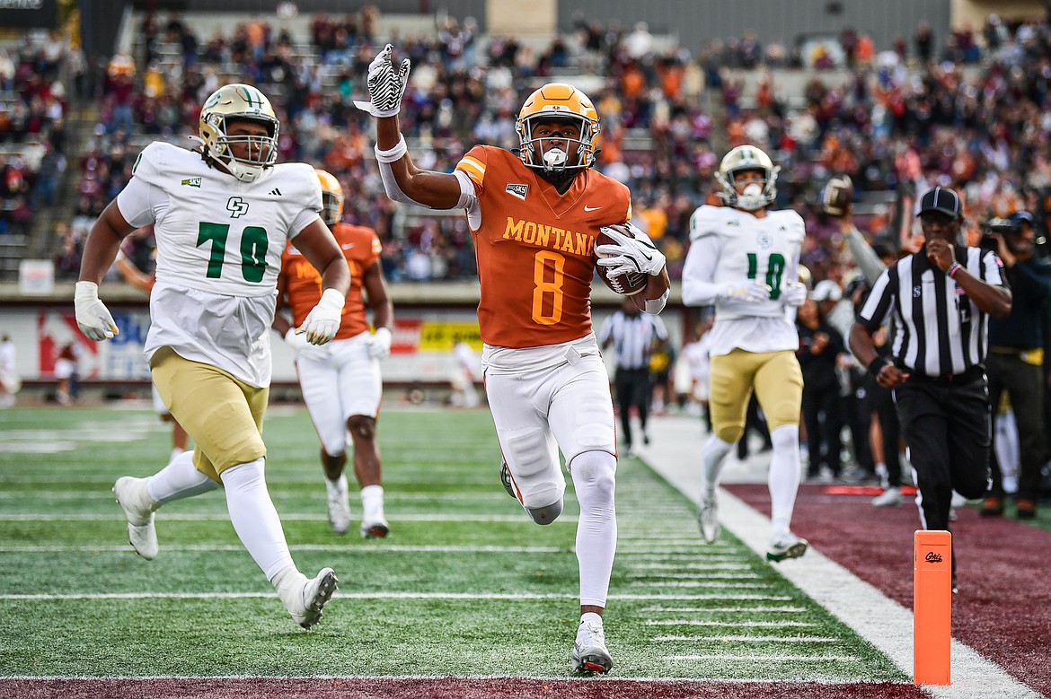 Grizzlies running back Eli Gillman (10) scores a touchdown on a 17-yard run in the fourth quarter against Cal Poly at Washington-Grizzly Stadium on Saturday, Oct. 11. (Casey Kreider/Daily Inter Lake)