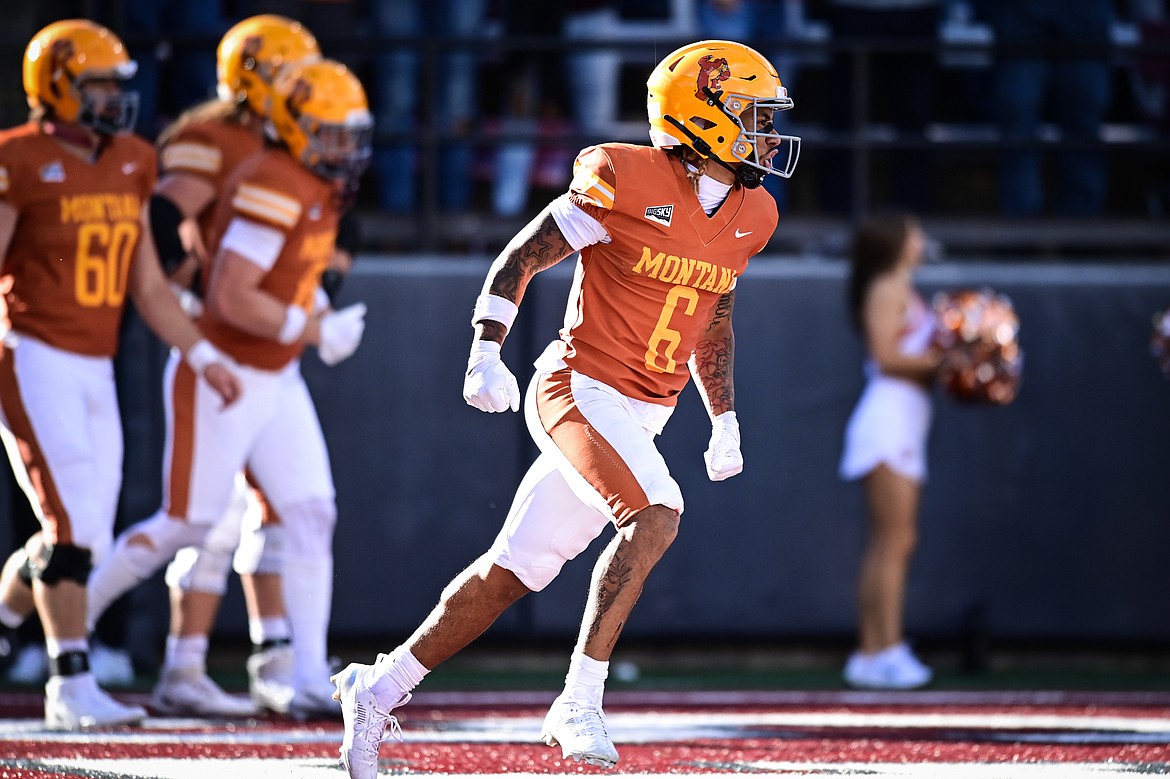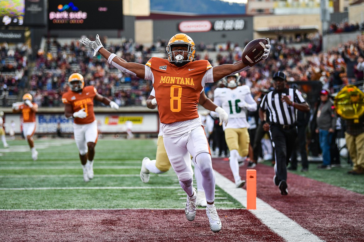 Grizzlies wide receiver Michael Wortham (6) celebrates after a 24-yard touchdown reception in the fourth quarter against Cal Poly at Washington-Grizzly Stadium on Saturday, Oct. 11. (Casey Kreider/Daily Inter Lake)