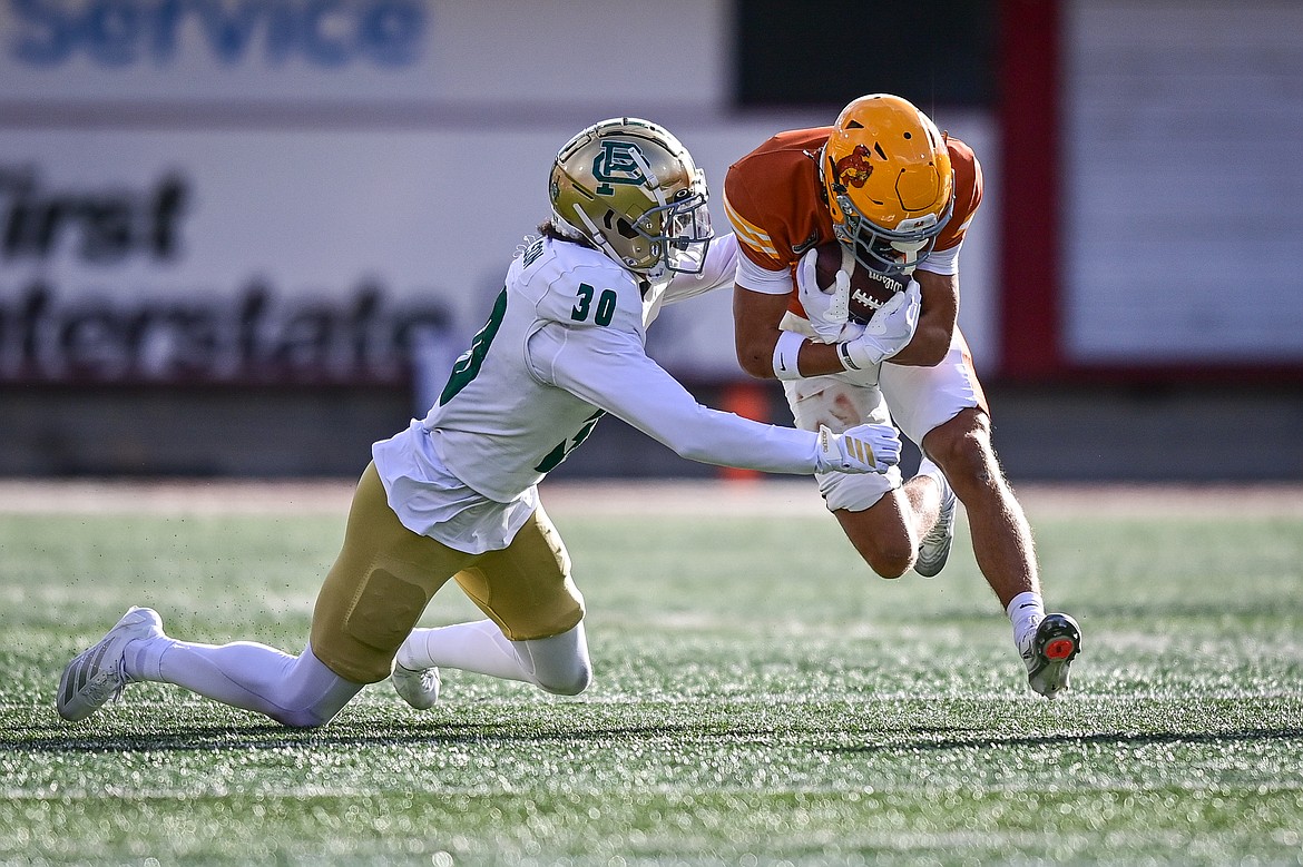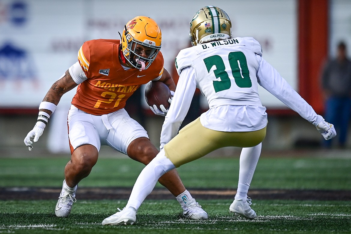 Grizzlies wide receiver Drew Deck (2) picks up yardage after a reception in the third quarter against Cal Poly at Washington-Grizzly Stadium on Saturday, Oct. 11. (Casey Kreider/Daily Inter Lake)