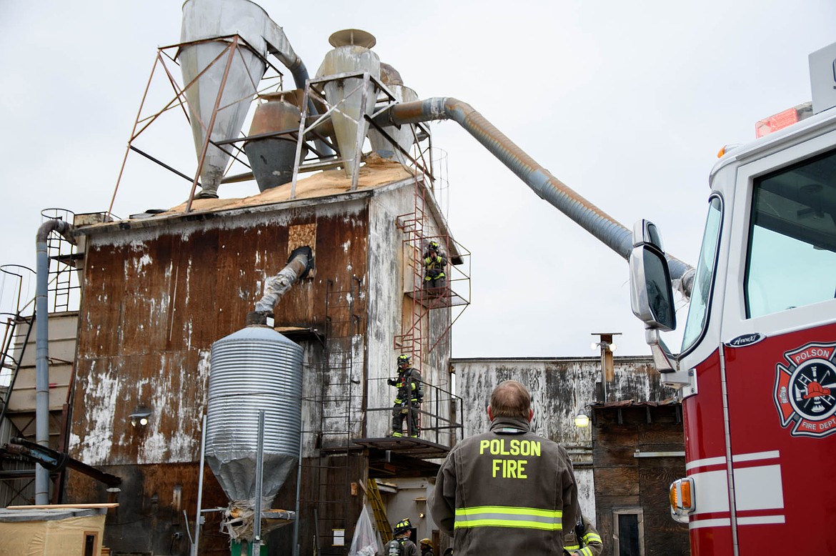 When the first unit arrived on scene, smoke could be seen coming from the roof of the sawdust silo building, City of Polson fire chief Clint Cottle said. Cottle explained the first report said there was a small electric motor on fire.