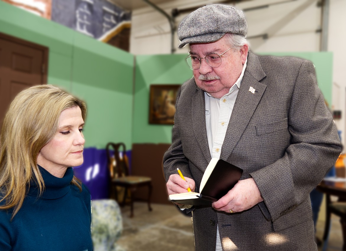 “I enjoy offering the creative prod that Scott — Excuse me, that Inspector Craddock — occasionally needs to stay on track,” offers Patty Thiel, who plays Miss Marple. “I’m having a lot of fun with this play.”