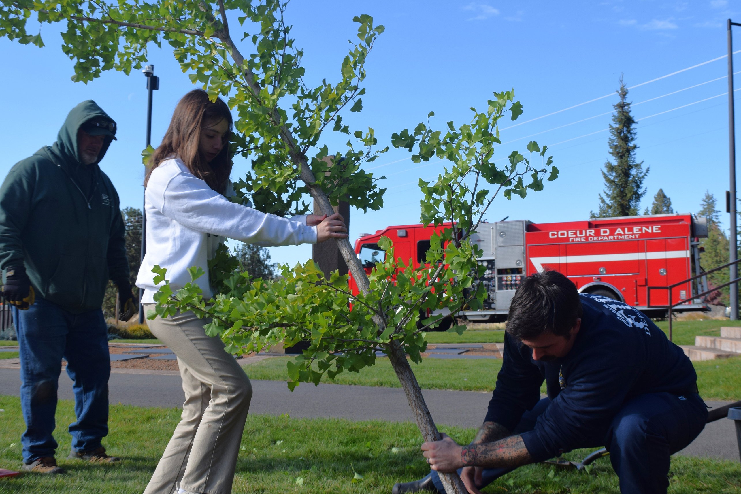 Several members of the Coeur d’Alene Fire Department joined Browne and her parents to help get the 8-foot-tall tree in the ground.