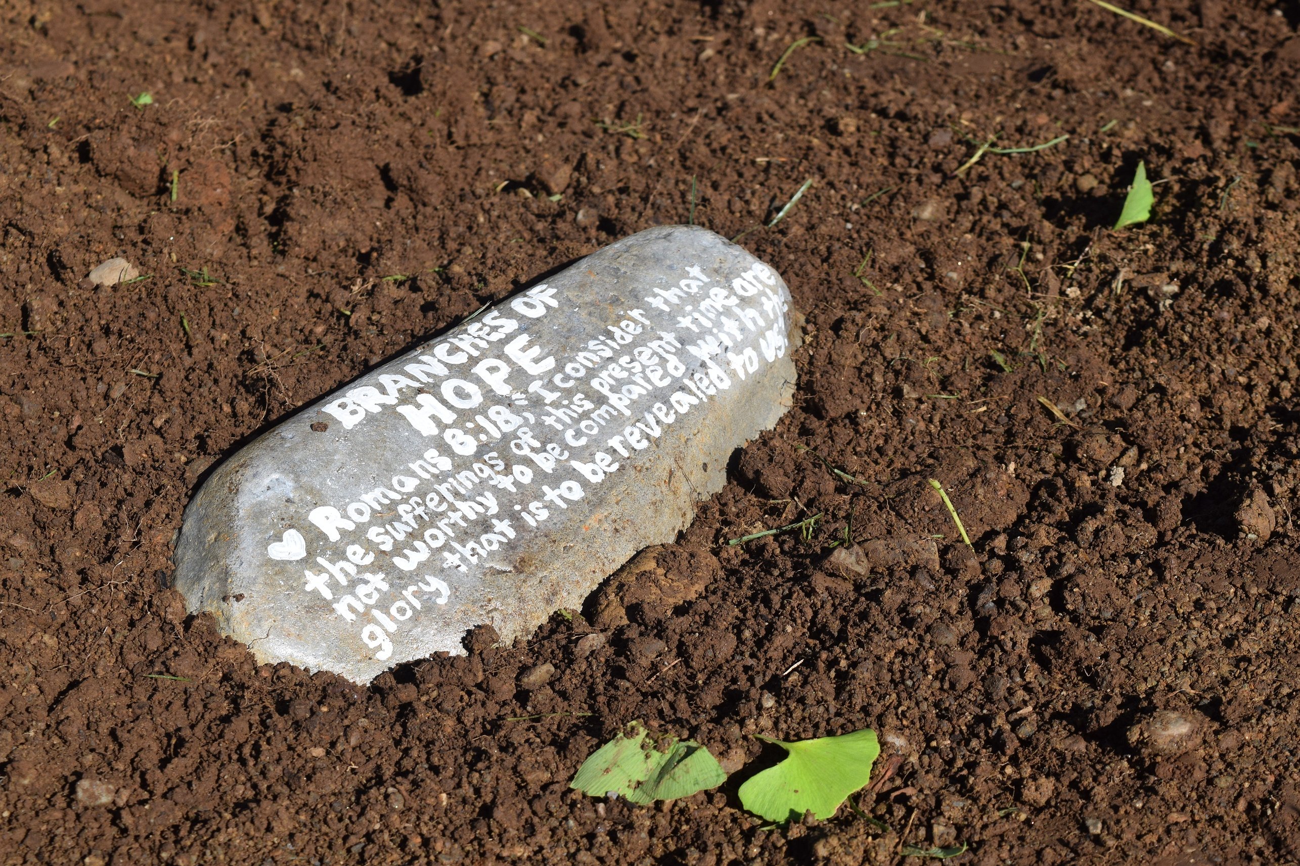 On that rock she had painted a favorite Bible verse, Romans 8:18: “I consider that the sufferings of this present time are not worthy to be compared with the glory that is to be revealed to us.”