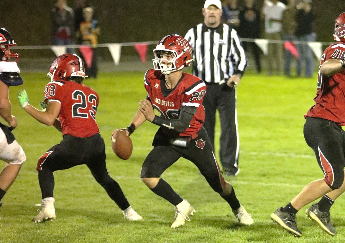 The Red Devils got on the scoreboard first, using a punishing running attack on their first scoring drive, striking paydirt on a bruising 14 yard run by fullback Cam Wengerd with 6:33 left in the first quarter to take a 6-0 lead.