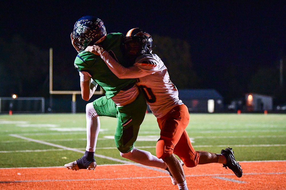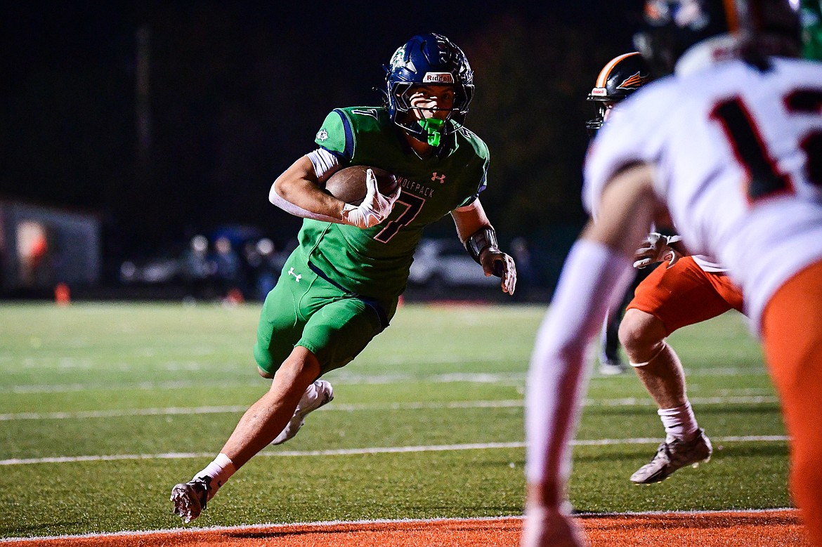 Glacier wide receiver Cooper Pelc (1) catches an 11-yard touchdown reception in the second quarter against Flathead at Legends Stadium on Thursday, Oct. 16. (Casey Kreider/Daily Inter Lake)
