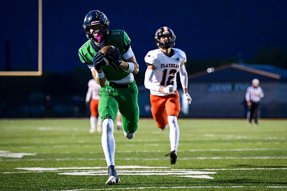 Glacier wide receiver Cooper Pelc (1) catches a 41-yard touchdown reception in the first quarter against Flathead at Legends Stadium on Thursday, Oct. 16. (Casey Kreider/Daily Inter Lake)