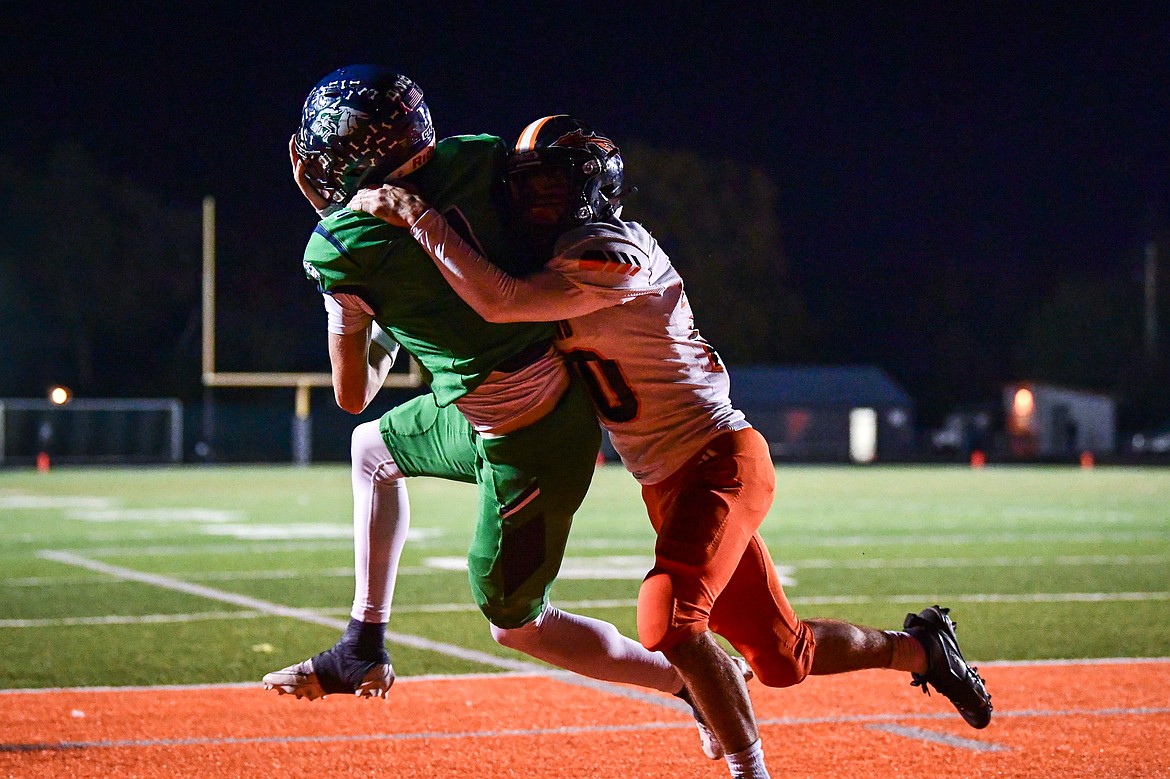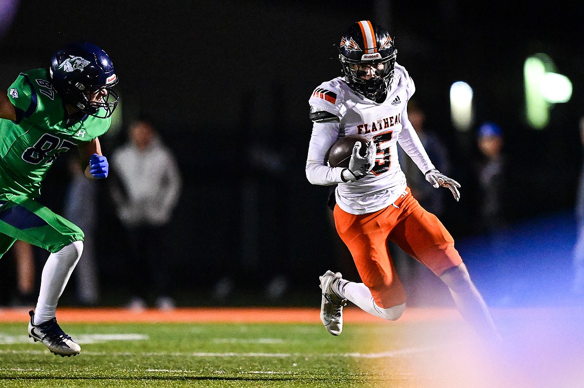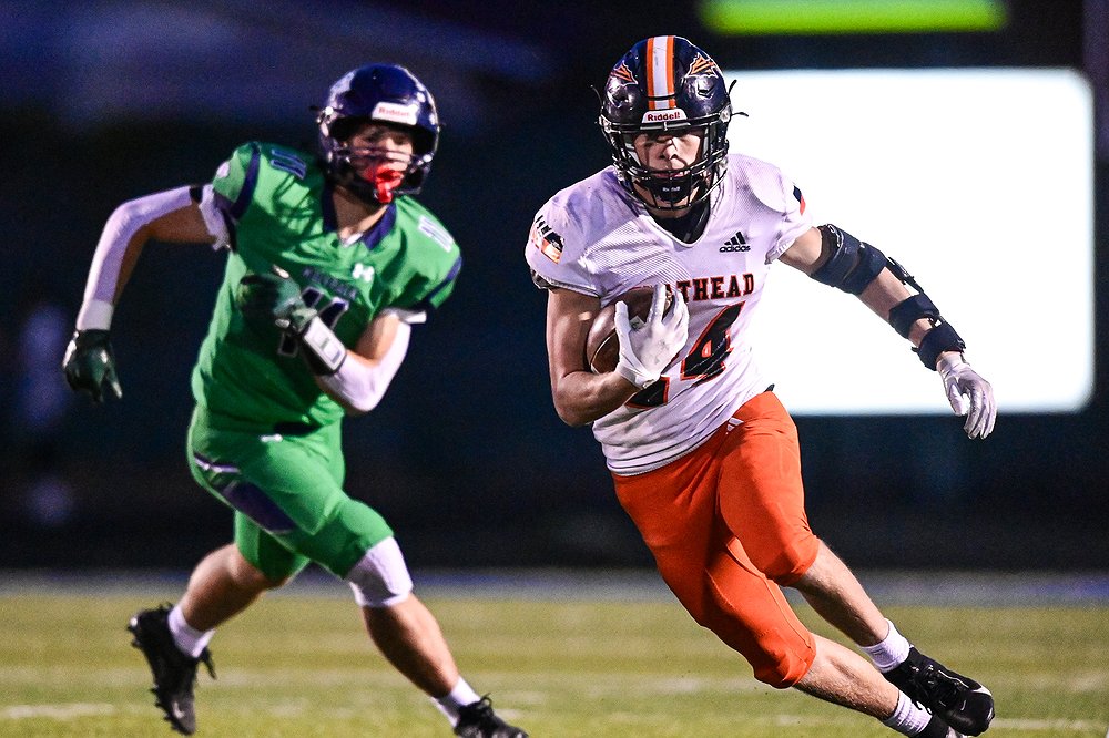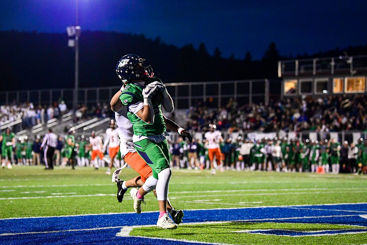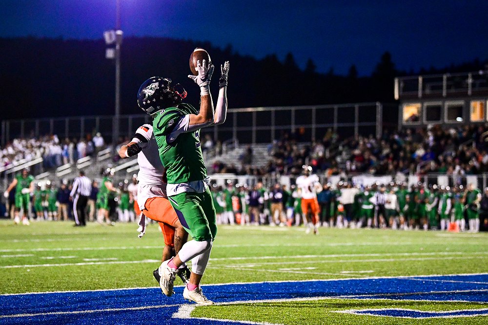 Glacier wide receiver Austin Gragg (5) catches a 33-yard touchdown reception in the first quarter against Flathead at Legends Stadium on Thursday, Oct. 16. (Casey Kreider/Daily Inter Lake)