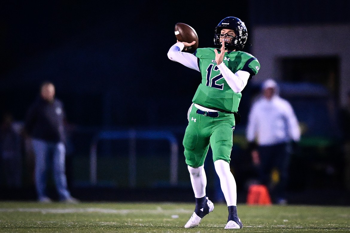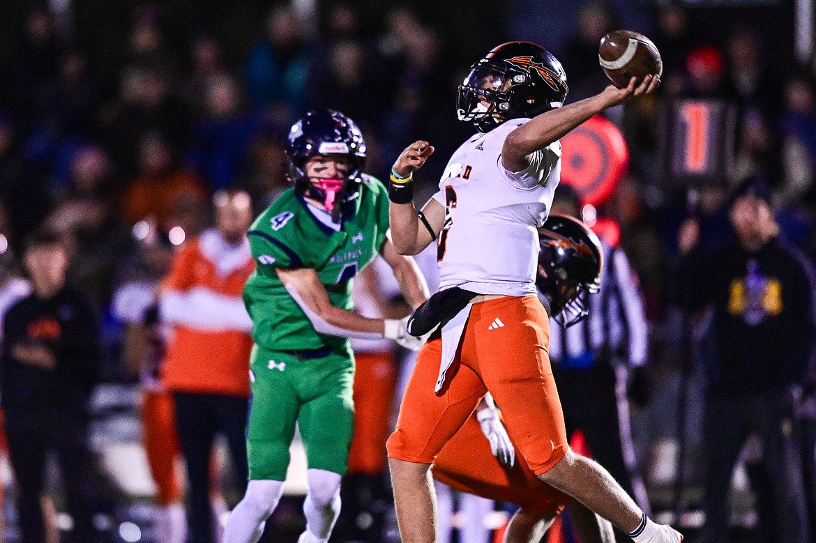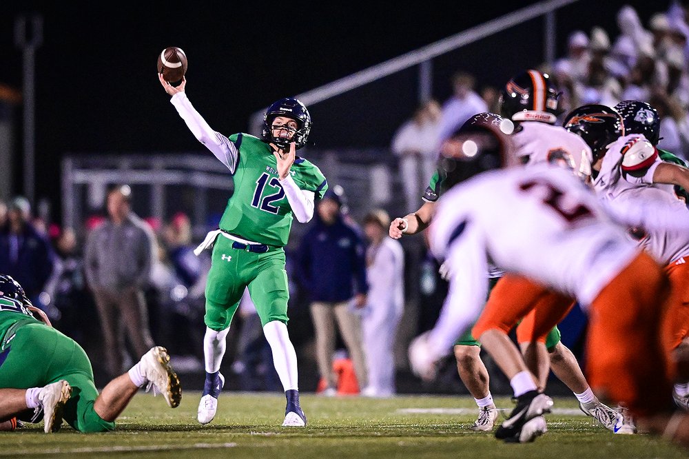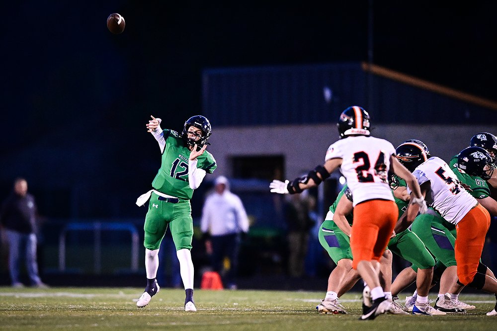 Glacier quarterback Jackson Presley (12) throws a 41-yard touchdown reception to wide receiver Cooper Pelc in the first quarter against Flathead at Legends Stadium on Thursday, Oct. 16. (Casey Kreider/Daily Inter Lake)