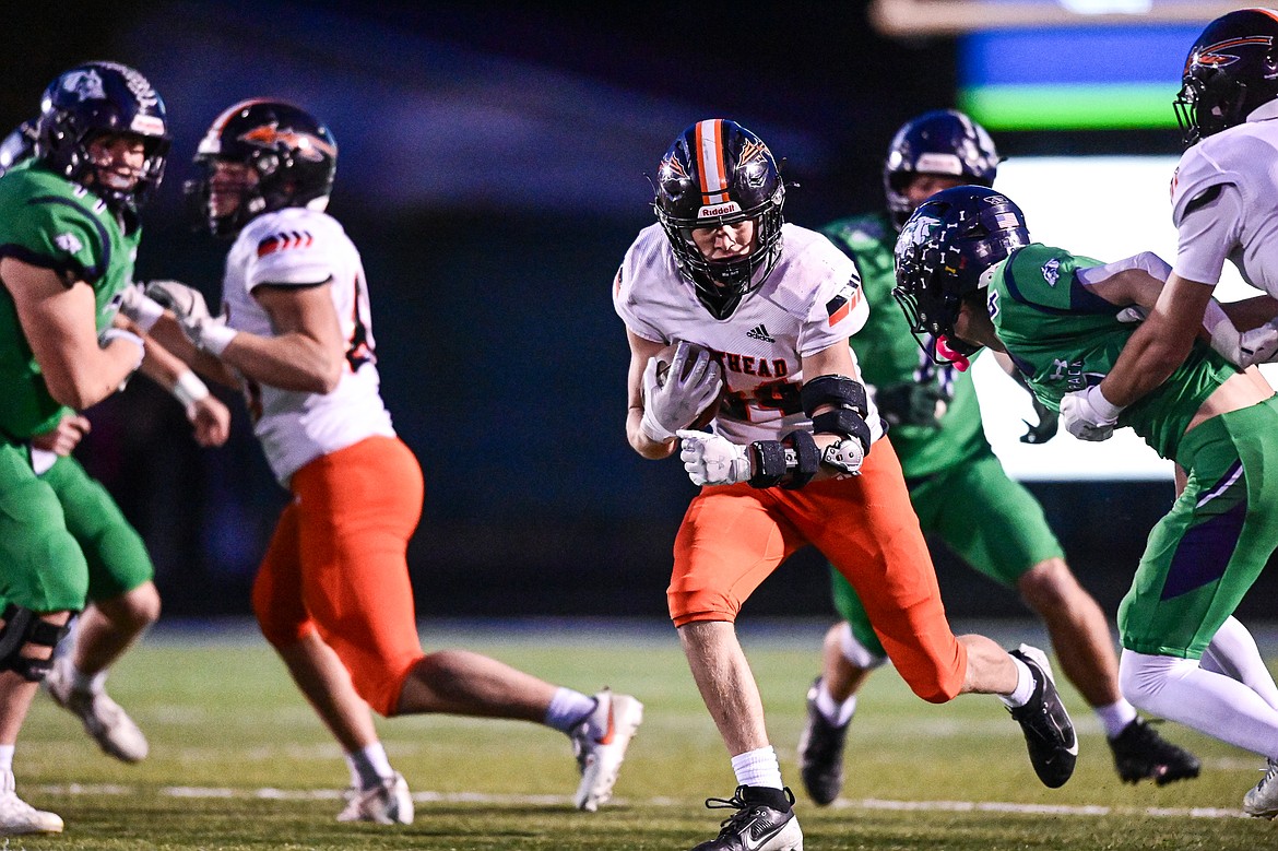 Glacier wide receiver Cooper Pelc (1) picks up yardage on a reception in the first quarter against Flathead at Legends Stadium on Thursday, Oct. 16. (Casey Kreider/Daily Inter Lake)