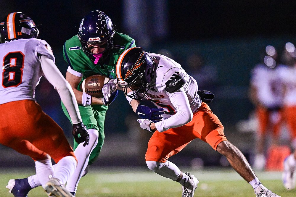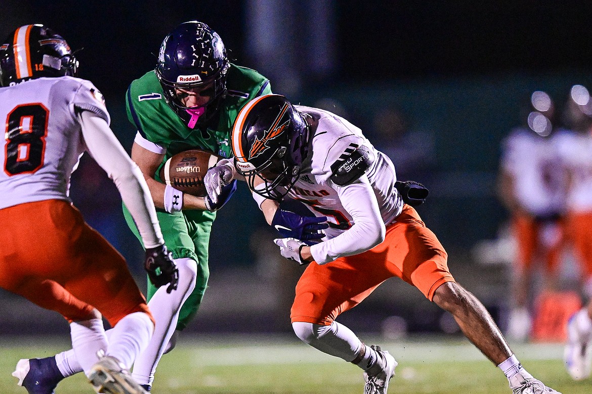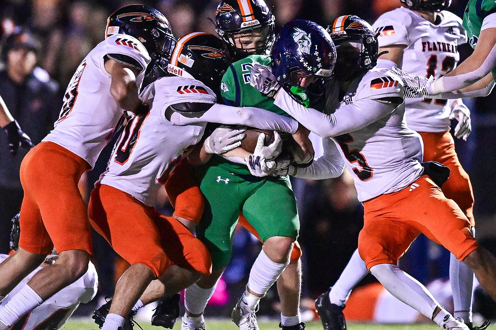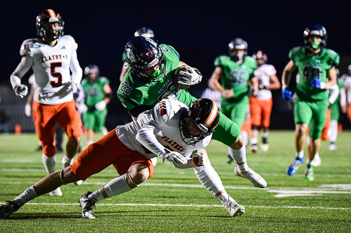 Flathead defensive back Oliver Rosenberg (5) tackles Glacier wide receiver Cooper Pelc (1) after a reception in the second quarter at Legends Stadium on Thursday, Oct. 16. (Casey Kreider/Daily Inter Lake)