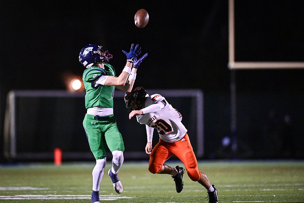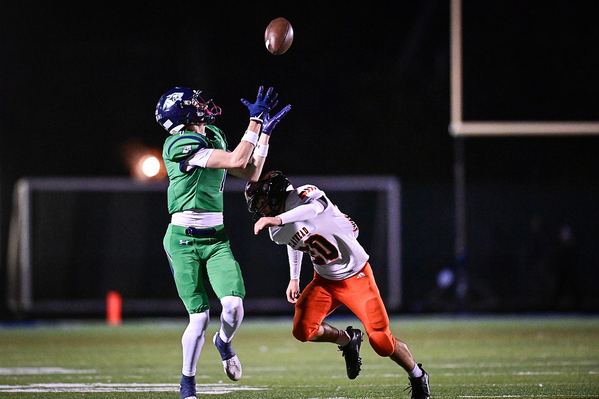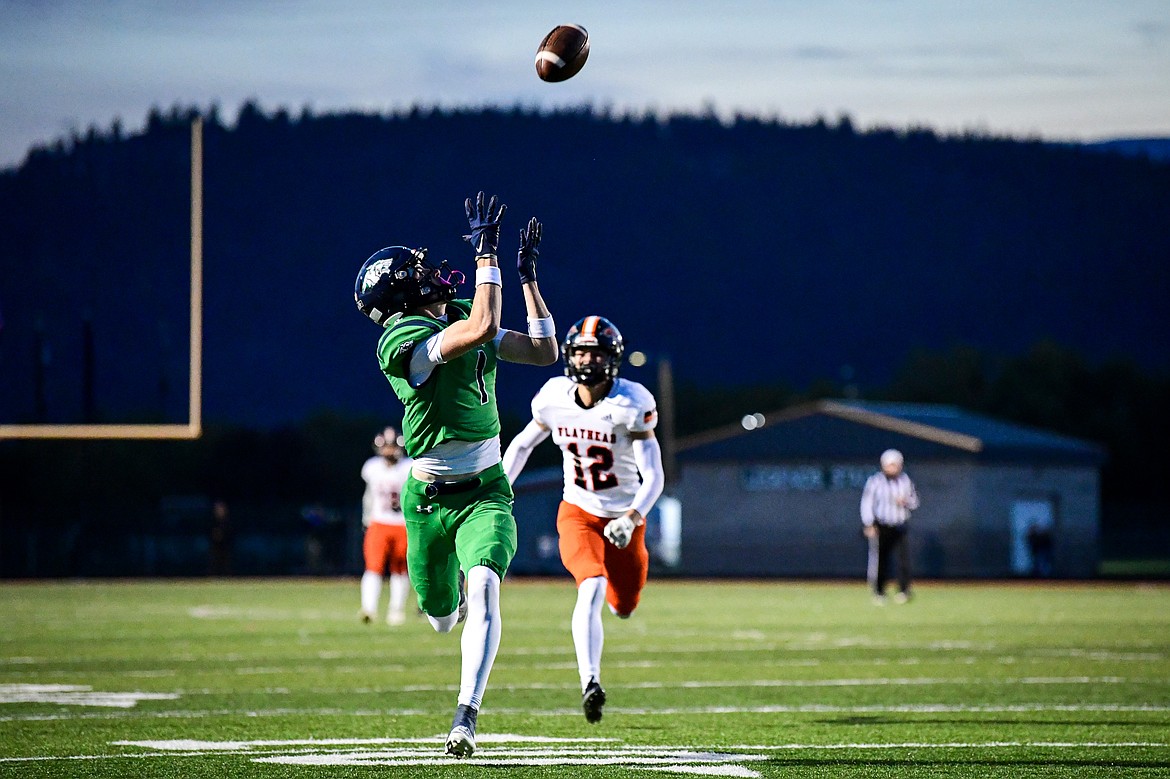 Glacier wide receiver Cooper Pelc (1) catches a pass in the second quarter against Flathead at Legends Stadium on Thursday, Oct. 16. (Casey Kreider/Daily Inter Lake)