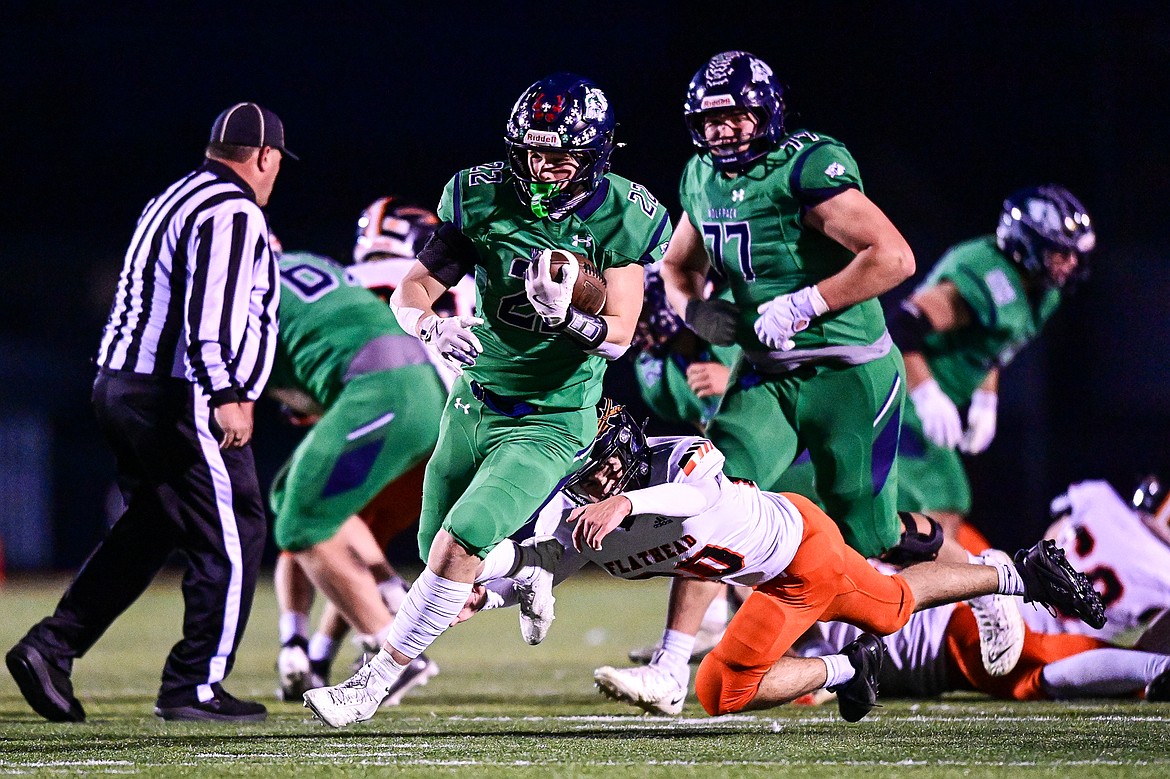 Flathead running back Nolan Campbell (24) picks up yardage on a run in the first quarter against Glacier at Legends Stadium on Thursday, Oct. 16. (Casey Kreider/Daily Inter Lake)